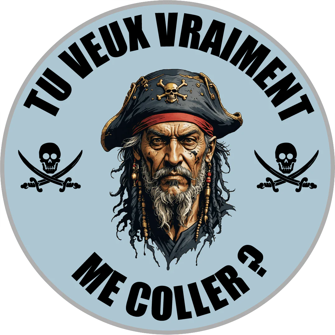 Ajoutez une touche d’humour et de caractère à votre véhicule avec cet autocollant pirate original. Fabriqué en Bretagne, cet autocollant de 9 cm de diamètre représente un pirate intrépide posant la question : « Tu Veux Vraiment Me Coller ? »