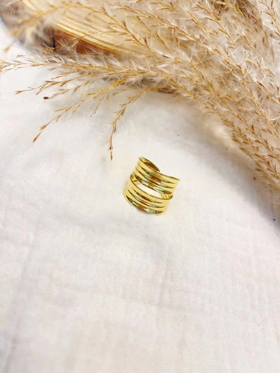Élégante et intemporelle, cette bague dorée en acier inoxydable séduit par son design à plusieurs anneaux superposés. Son effet graphique et moderne en fait un bijou facile à porter au quotidien comme en soirée. Ajustable, elle s’adapte à toutes les morphologies pour un confort idéal.