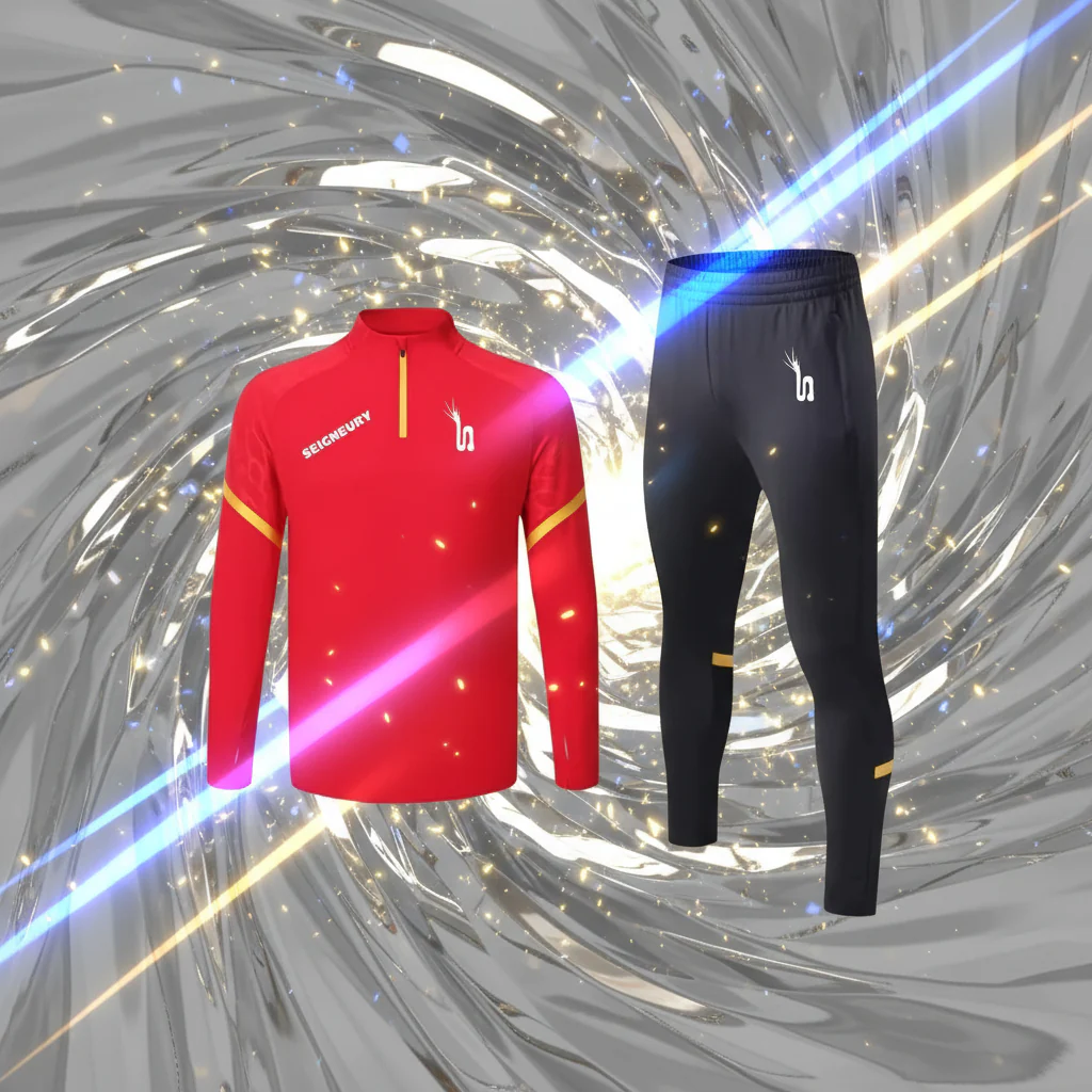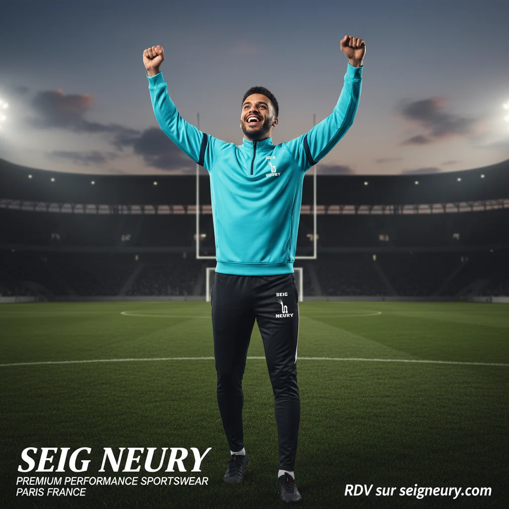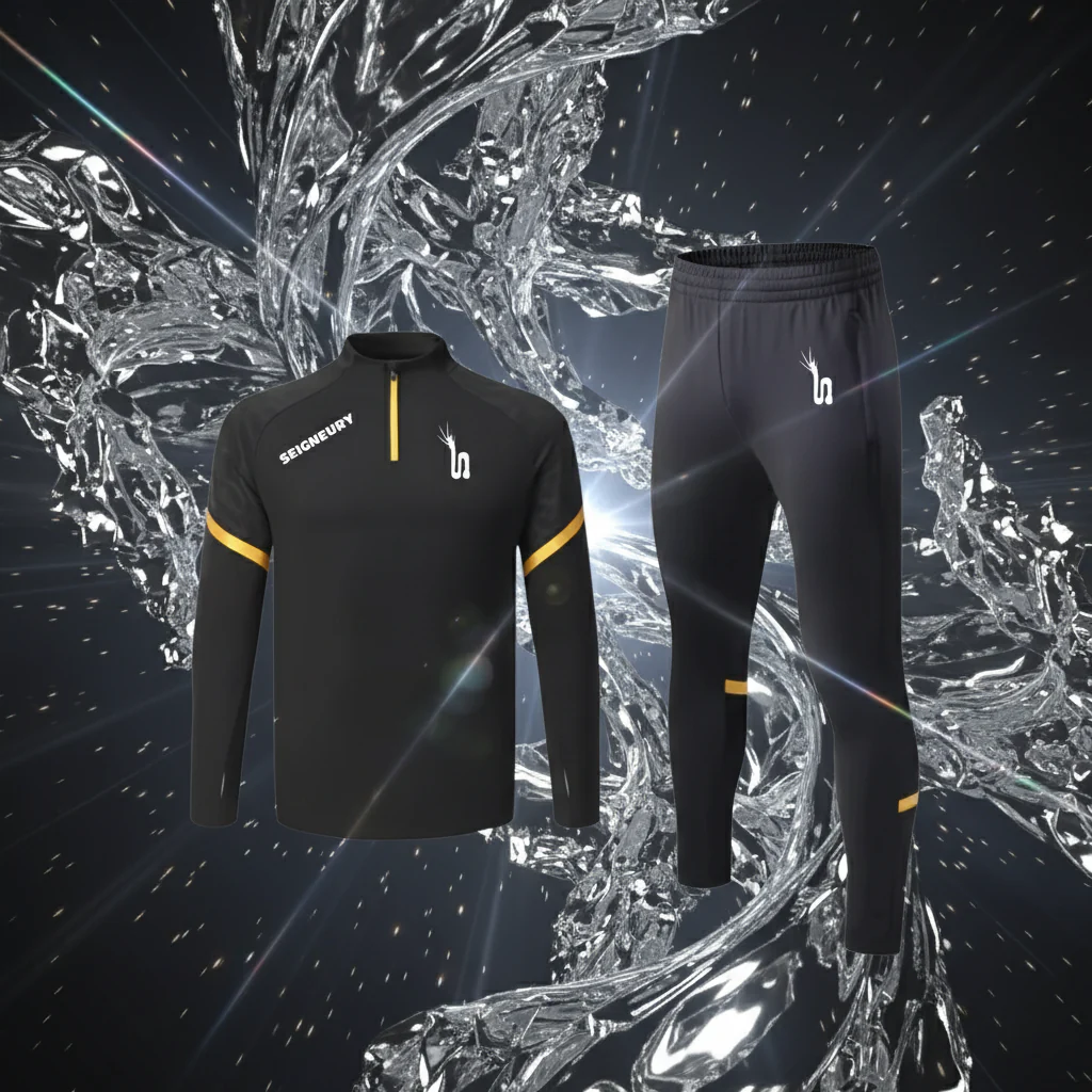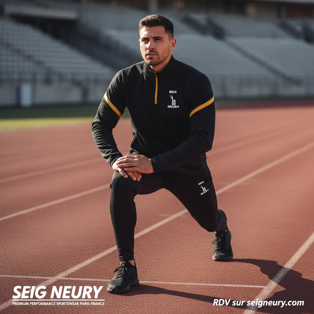 Le haut présente une coupe ergonomique, avec fermeture zippée selon le modèle, tandis que le pantalon est équipé de deux poches latérales pratiques. L’ensemble intègre l’identité visuelle SEIGNEURY avec un logo brodé ou imprimé selon la version choisie.