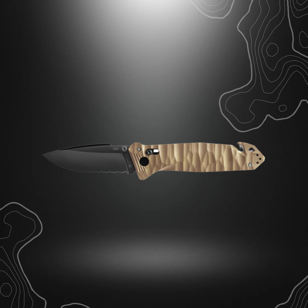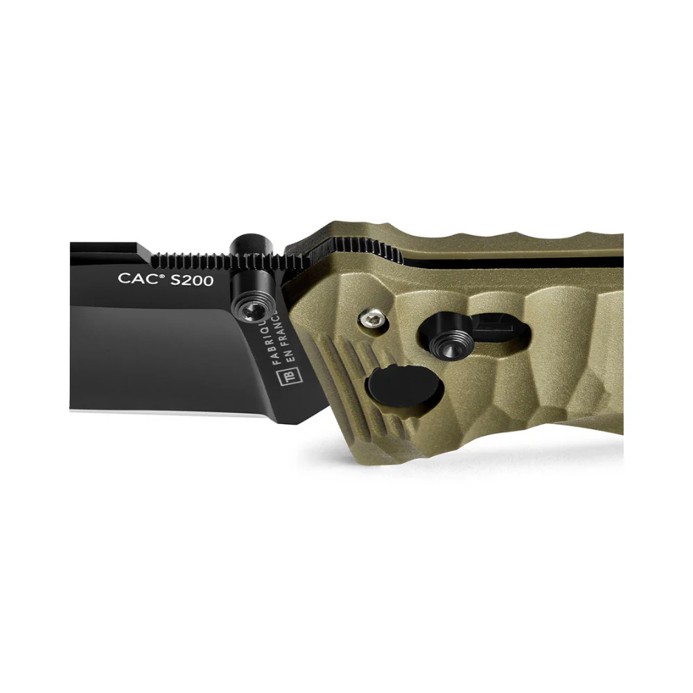 Le couteau Cac S200, fabriqué en France à Thiers par Tarrerias-Bonjean, est un véritable concentré de toutes les technologies de pointe que l’on peut attendre d’un couteau opérationnel. Avec sa lame mixte (lisse + serration) et son coupe-sangle, il se distingue du couteau Cac par son manche toxifié et l’absence de tire-bouchon.