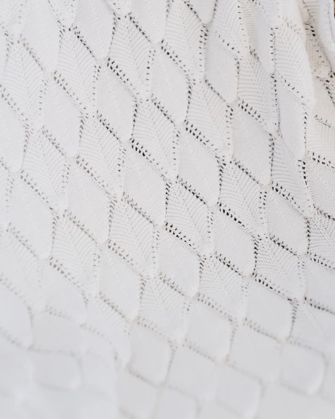 Ce bijou artisanal est tricoté dans un style crochet, créant un motif délicat qui évoque le charme intemporel du fait à la main. Le blanc éclatant de cette couverture ajoute une touche d’innocence et de pureté à l’environnement de votre bébé, qu’il s’agisse d’une sieste douillette dans le berceau ou d’un moment de câlin sur le canapé.