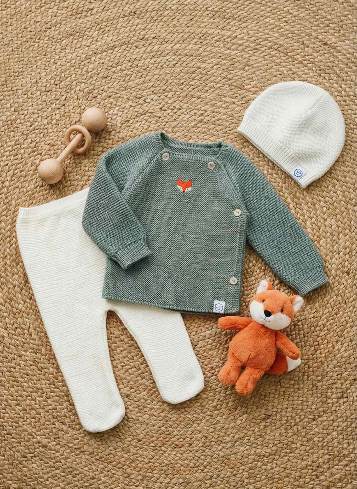 Composé d’une brassière blanche délicatement brodée d’un petit renard, d’un pantalon blanc confortable et d’un bonnet assorti, cet ensemble est idéal pour un trousseau de naissance ou un cadeau plein de tendresse.