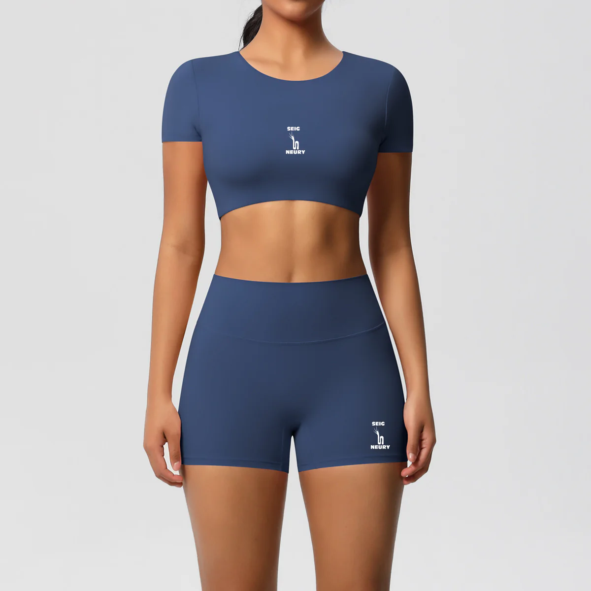 Ensemble sport 2 pièces pour femme : top à manches courtes et short gainant. Tissu respirant en nylon double face, coupe skinny, confort seconde peau. Idéal yoga, fitness, course. Disponible en plusieurs coloris.