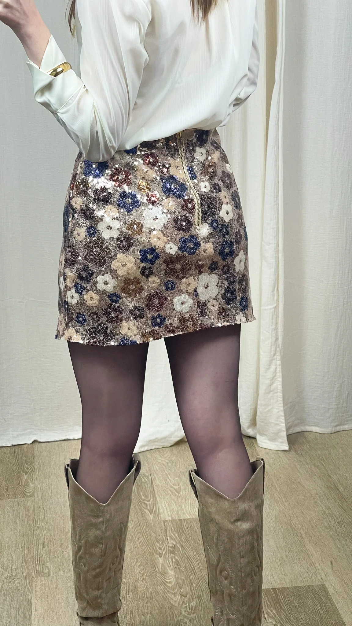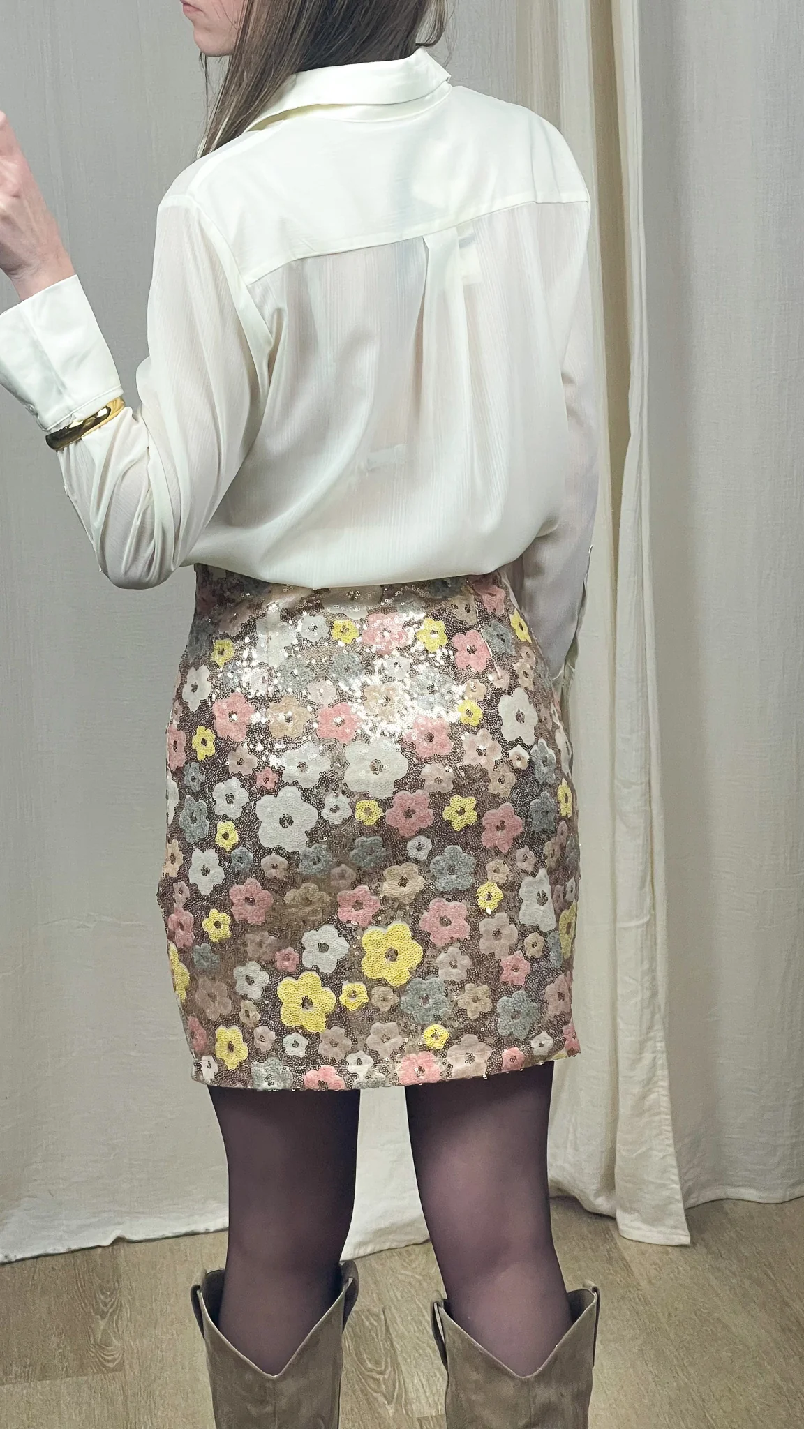La Jupe Rose apporte une touche festive et féminine à vos looks grâce à son motif entièrement brodé de sequins floraux. Une pièce forte qui illumine instantanément une tenue, tout en restant facile à associer avec un pull doux, une chemise ou un top habillé.