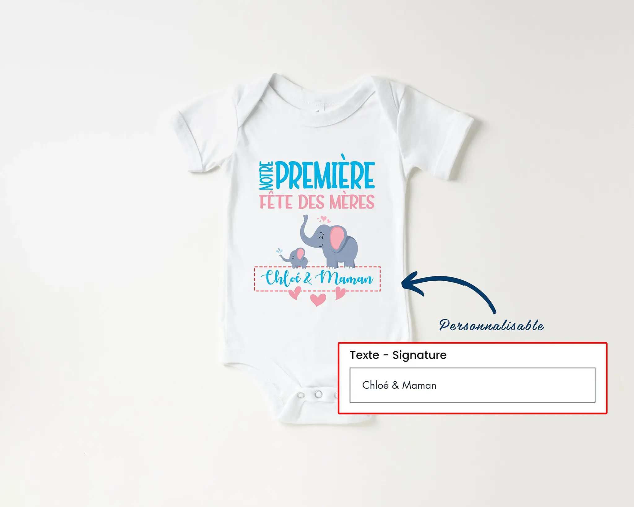 Craquez pour ce body bébé personnaliser avec la phrase « Notre Première Fête Des Mères » pour immortaliser ce moment spécial. Ajoutez une touche personnelle en choisissant votre texte ou prénom, pour le rendre encore plus unique🌈👶!
