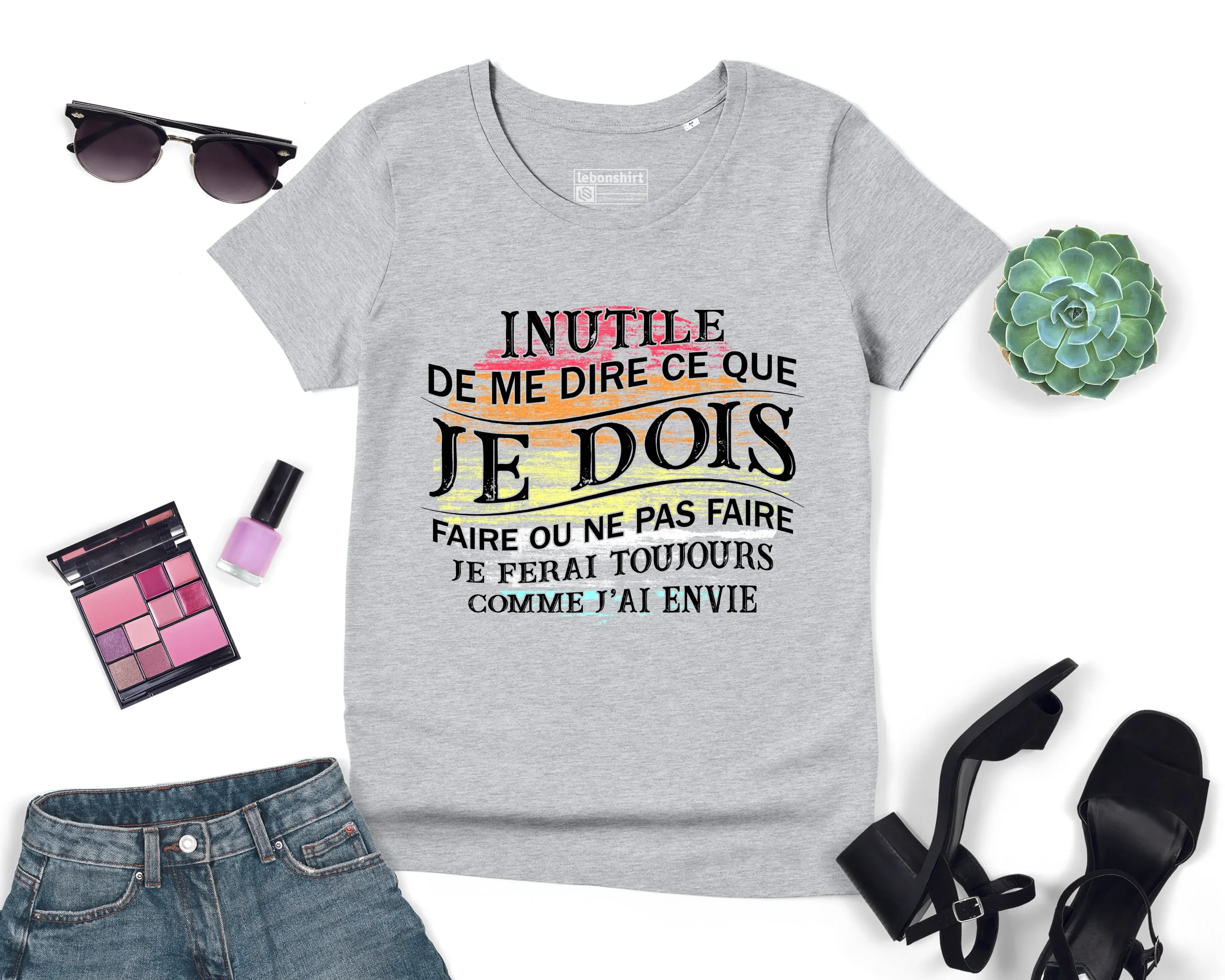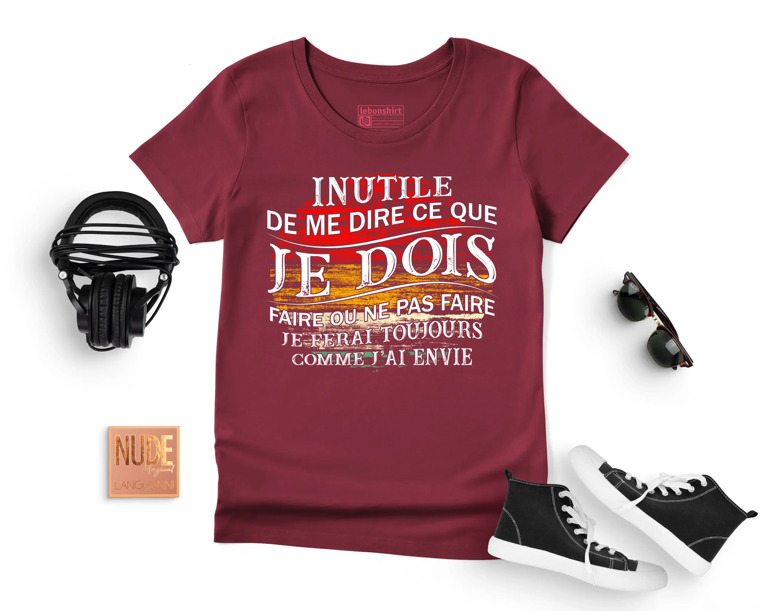 L’impression du motif « Inutile De Me Dire Ce Que Je Dois Faire – Je Ferai Toujours Comme J’ai Envie », faite en France, ajoute une touche d’originalité et d’humour à ce t-shirt. Ce message encourage les femmes à suivre leur propre chemin et à ne pas se laisser influencer par les autres. C’est le cadeau parfait pour les femmes qui ont une forte personnalité et qui assument leurs choix.