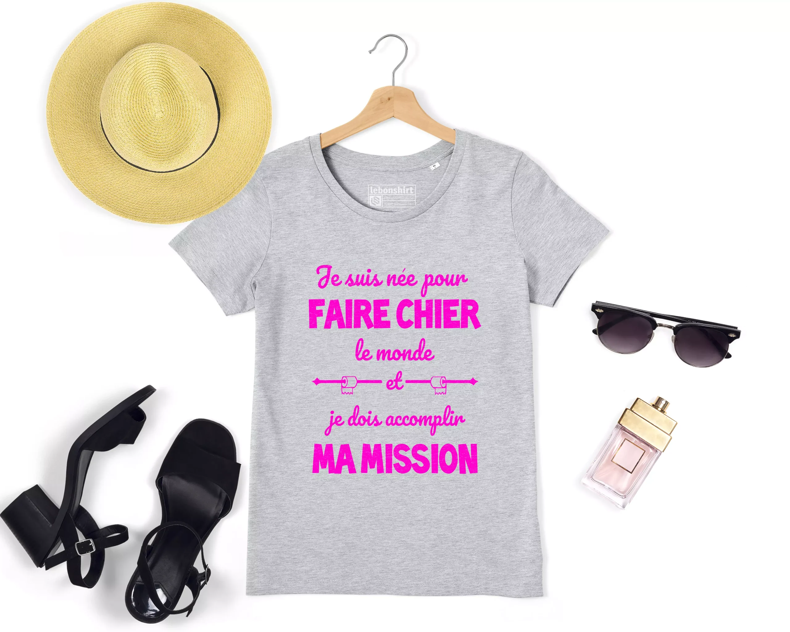 Le T-shirt Lebonshirt® Premium Femme Coton Bio – Je Suis Née Pour Faire Chier Le Monde a un ourlet bas de manches et un ourlet inférieur avec double surpiqûre pour une durabilité accrue. Les couleurs rose et gris sont chinées pour un look plus tendance.
