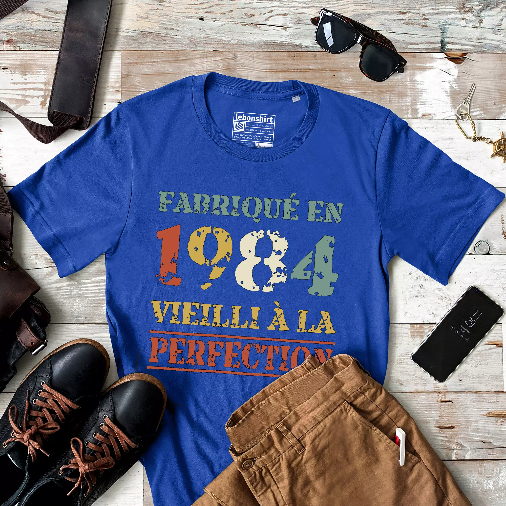 Vous cherchez un cadeau d’anniversaire original et amusant pour un homme ? Le T-shirt Premium Homme de Lebonshirt® est la réponse à vos attentes ! Ce t-shirt présente une phrase amusante « Fabriqué en 1984, Vieilli à la Perfection », ce qui en fait un choix idéal pour les hommes qui apprécient la qualité, le style rétro et l’humour.
