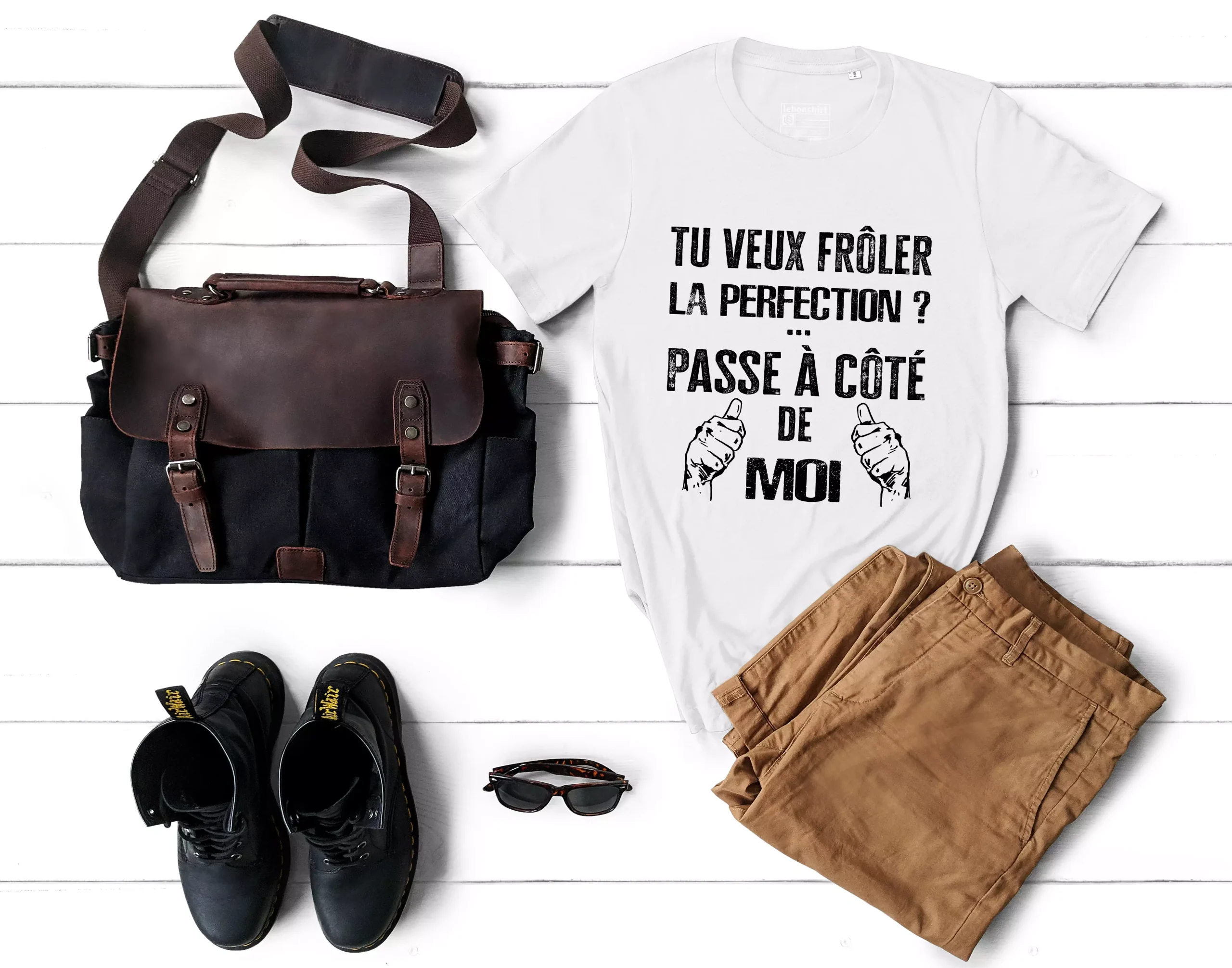 Le design du T-shirt est également un atout majeur. Avec sa phrase accrocheuse « Tu veux frôler la perfection ? Passe à côté de moi », ce T-shirt affirme haut et fort ton sens de l’humour et ta confiance en toi. Parfait pour les sorties entre amis, les soirées décontractées ou tout simplement pour afficher ton style au quotidien.