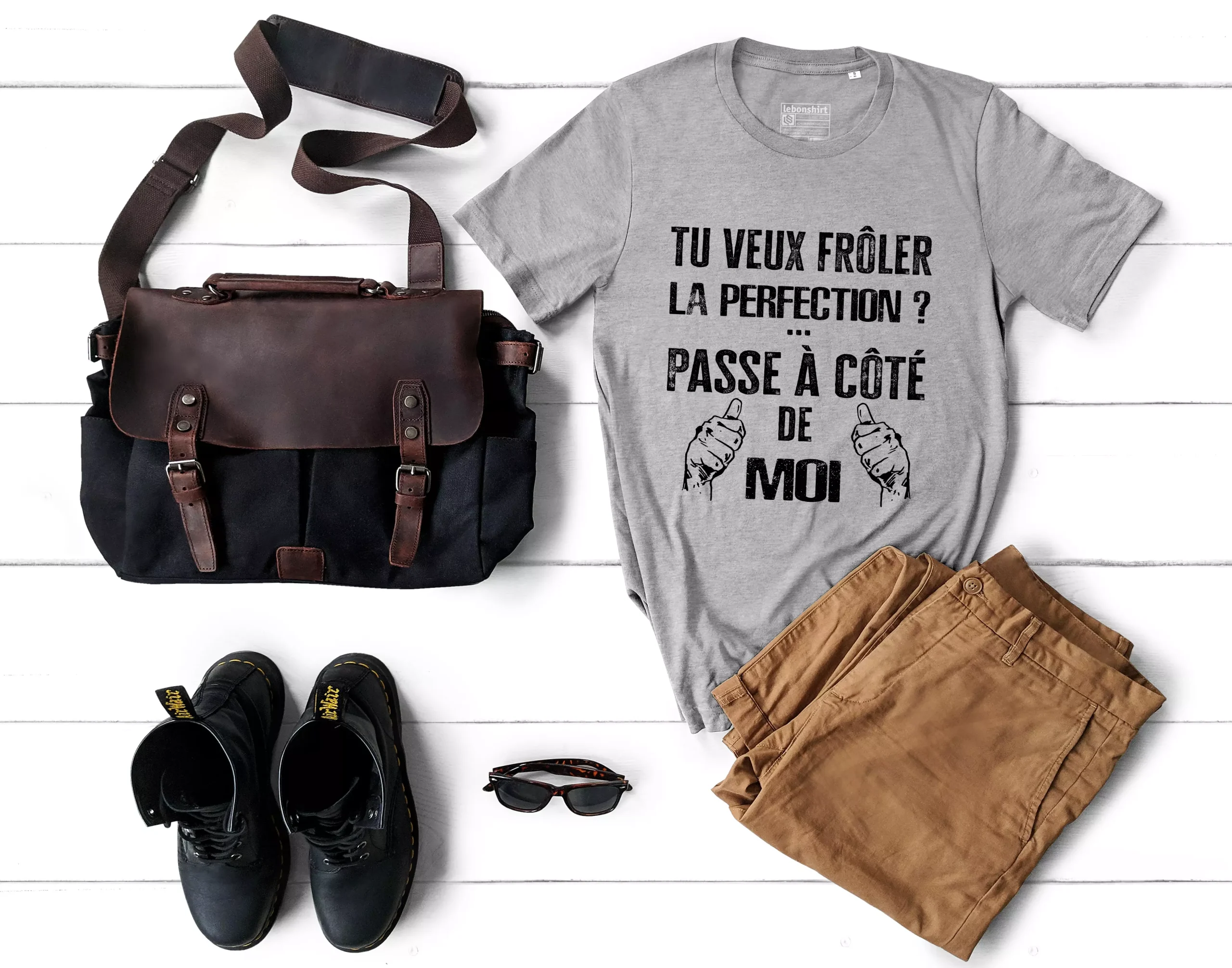 Tu veux frôler la perfection ? Alors n’hésite plus et passe à côté de moi. T-shirt Premium Homme en coton bio de Lebonshirt®. Conçu pour les hommes avec un sens de l’humour pointu et un désir de qualité, ce T-shirt est la quintessence du style décontracté.