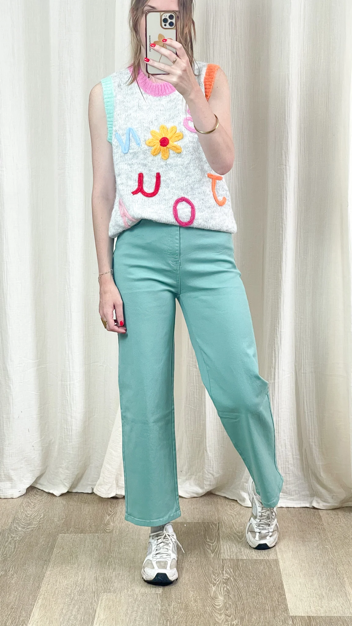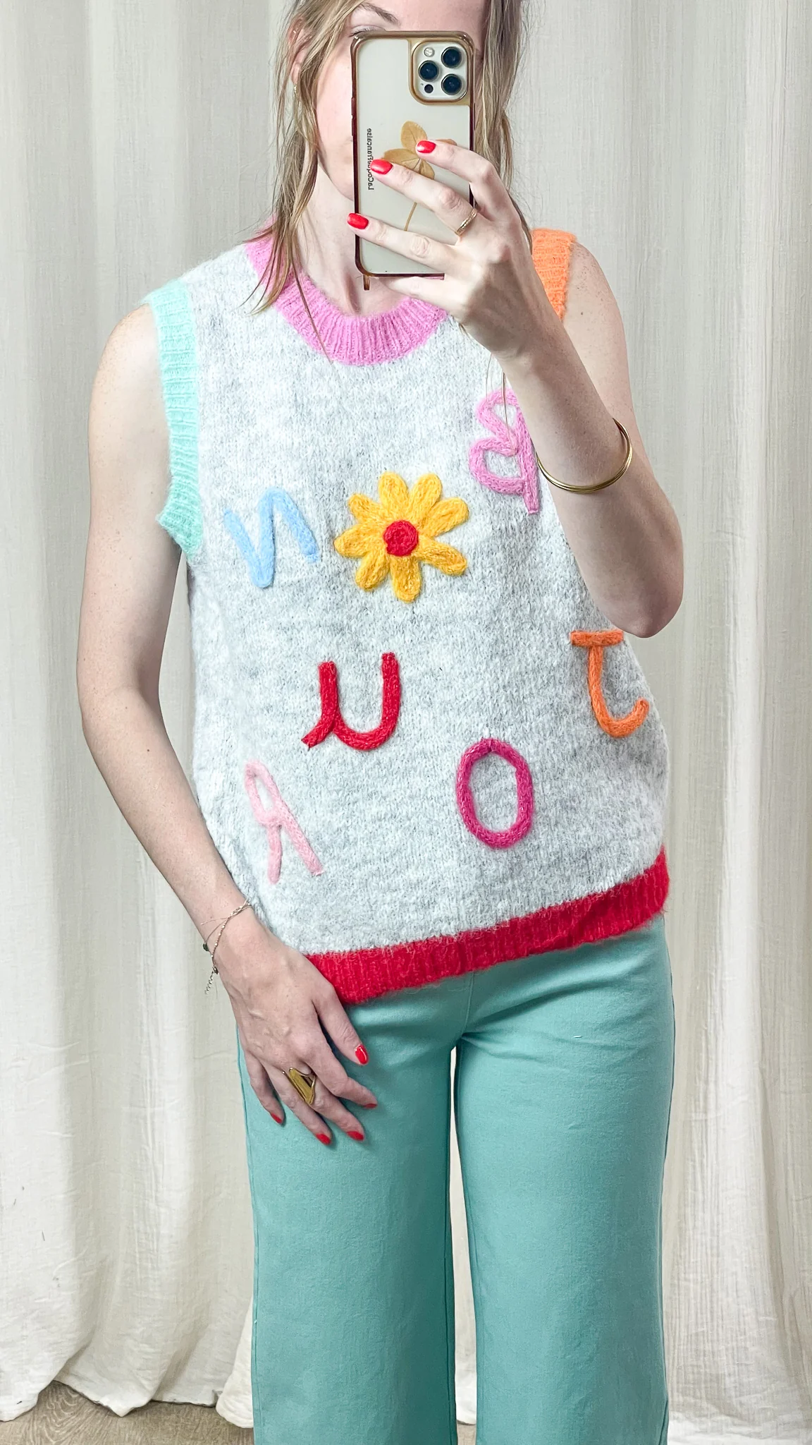 Le Pull Bonjour est la pièce fun et vitaminée qui met instantanément de bonne humeur ! Avec ses lettres colorées en relief et sa fleur en maille, il apporte une touche ludique et originale à vos tenues. Confortable et tendance, c’est le pull parfait pour affirmer son style avec légèreté.