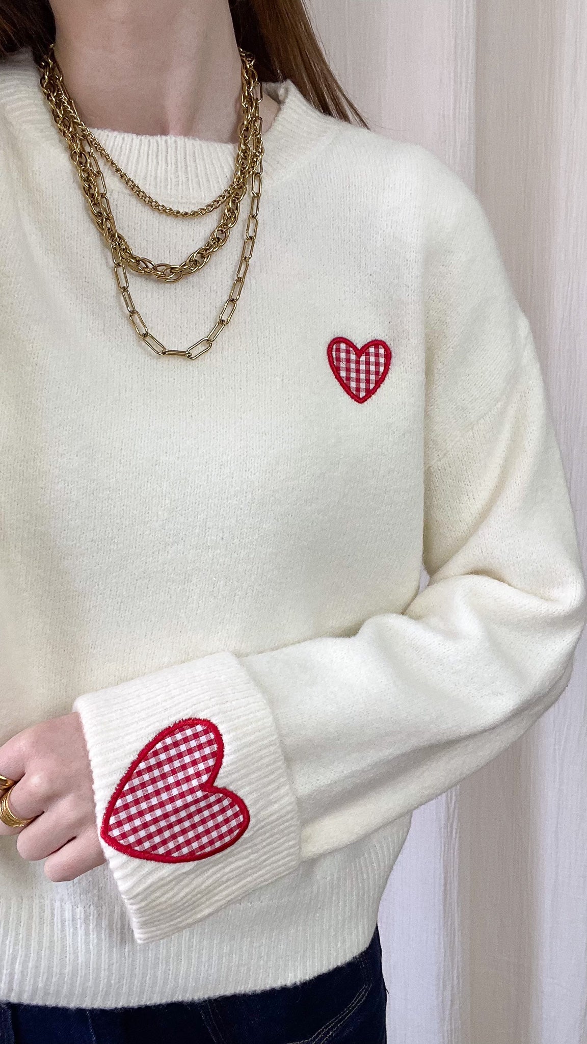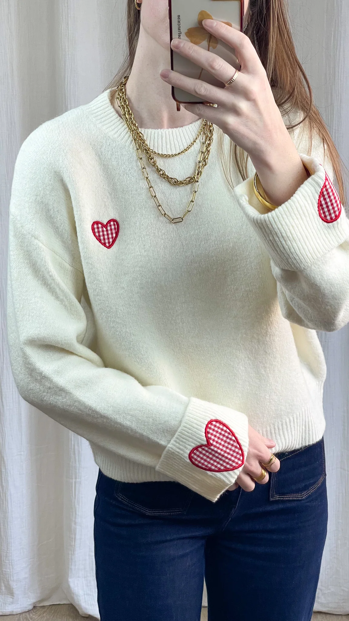 Ce pull en maille écrue se distingue par ses jolis patchs cœur vichy rouge, délicatement placés sur la poitrine et les manches. Des détails discrets mais pleins de charme, qui apportent une touche romantique et originale à une pièce intemporelle.