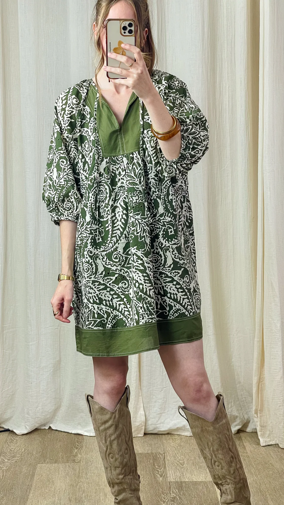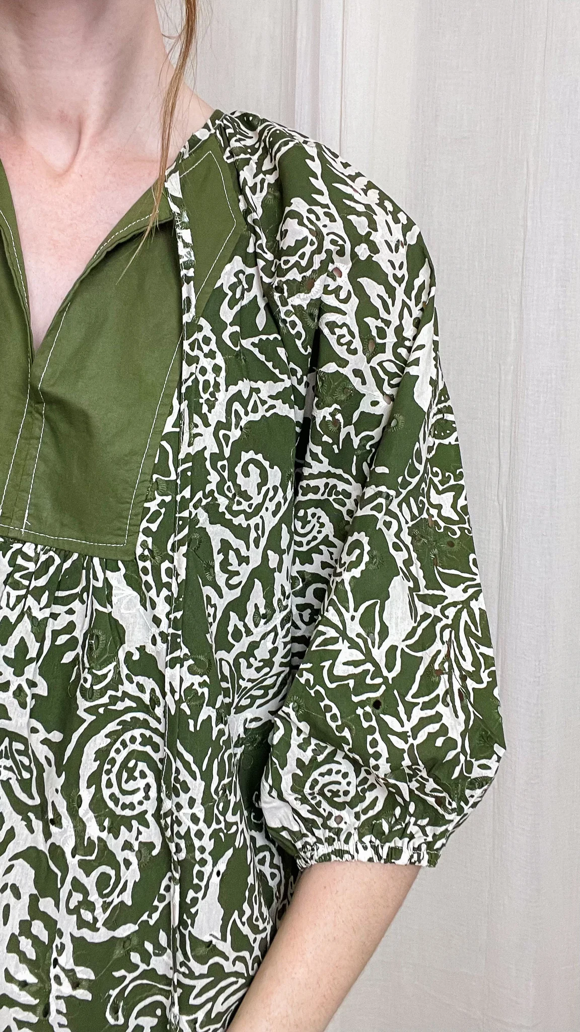 La Robe Danaé séduit par son allure bohème et son imprimé végétal vert et écru. Sa coupe ample et fluide offre un confort absolu tout en conservant une silhouette féminine et décontractée. Le col tunisien et les manches bouffantes 3/4 apportent une touche authentique, tandis que les finitions contrastées unies sur le buste et l’ourlet subliment l’ensemble avec élégance.