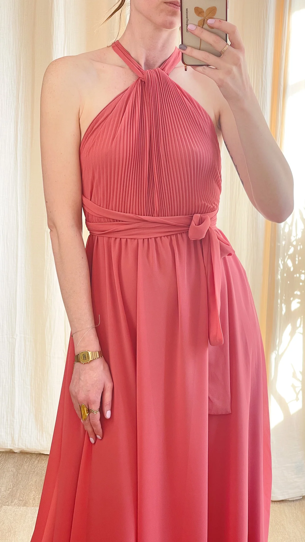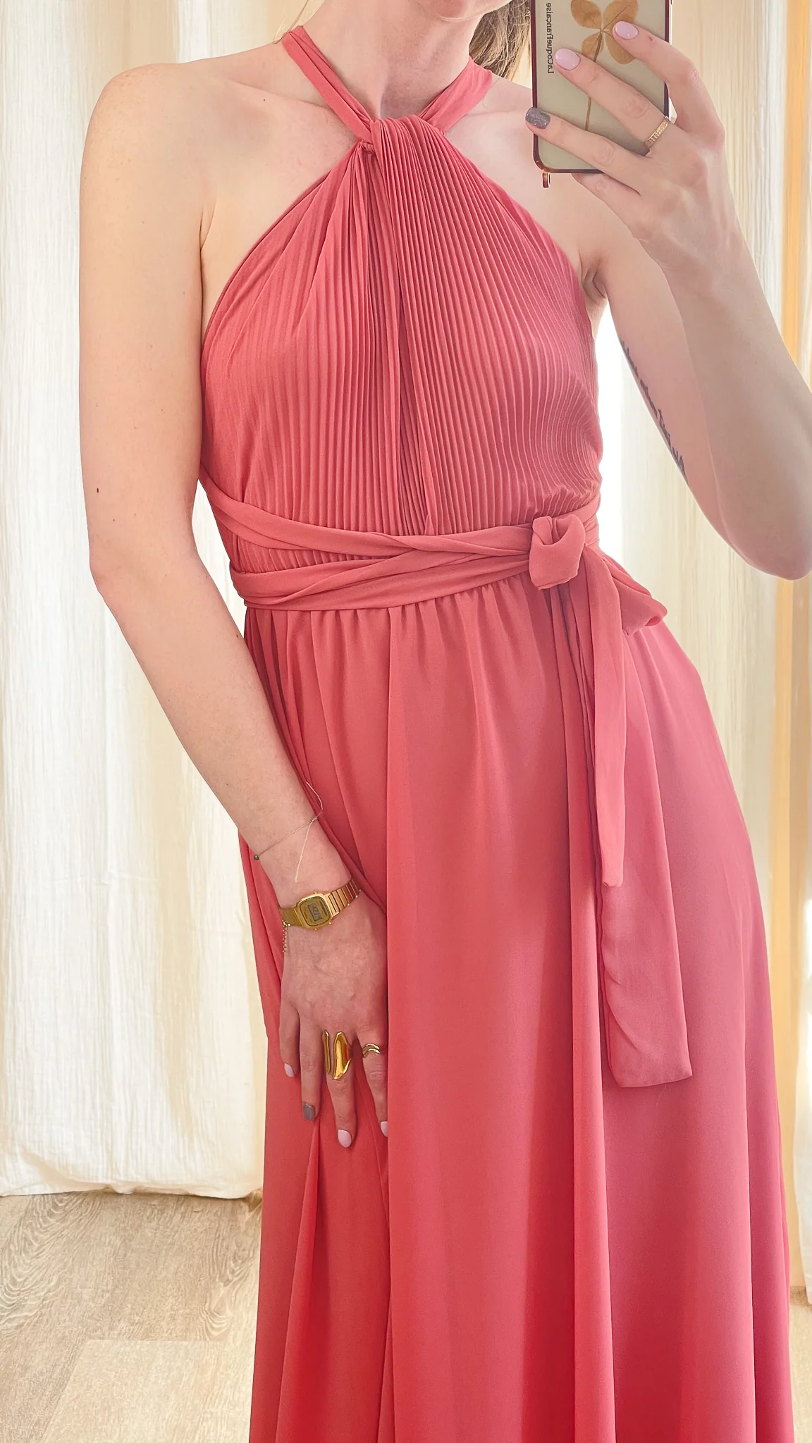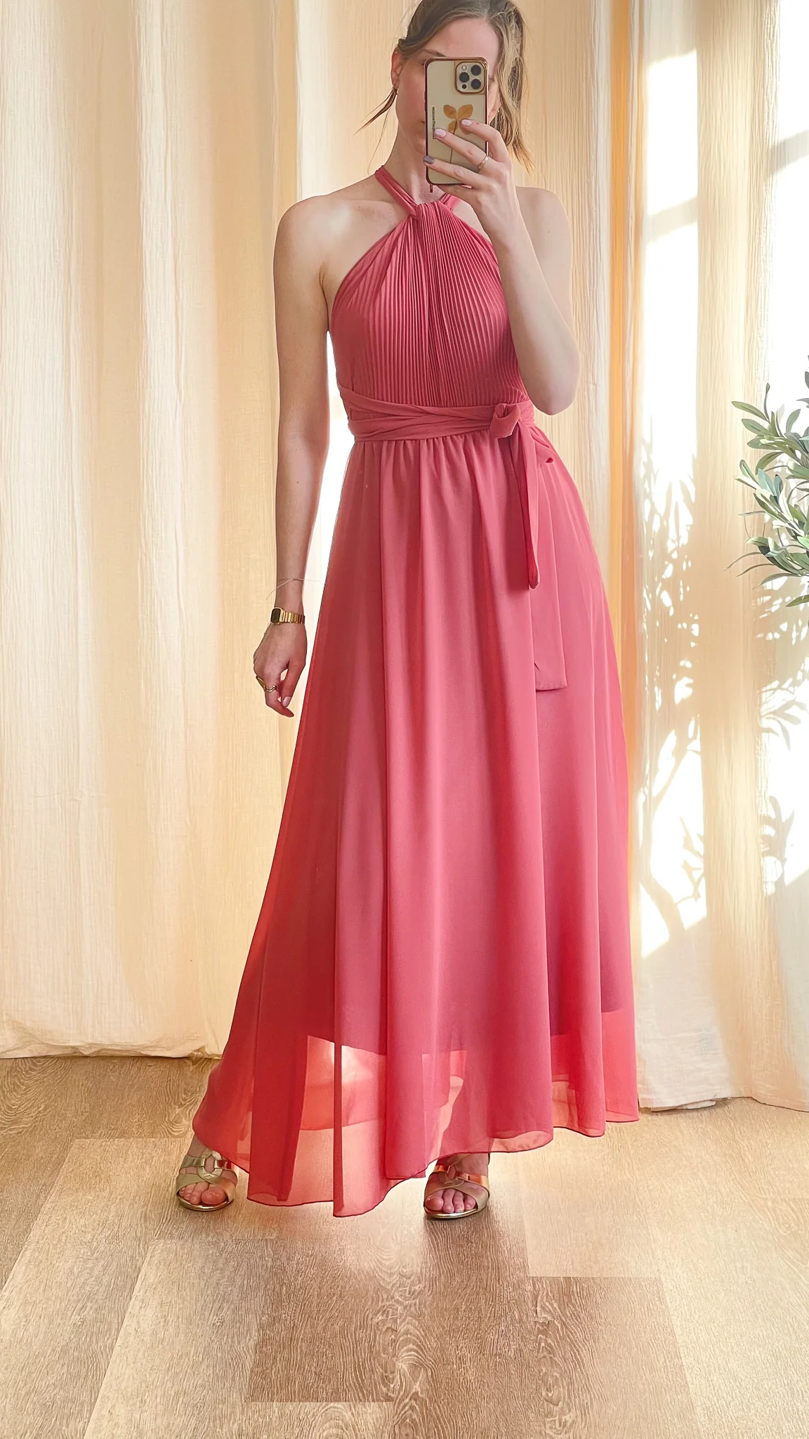 Élégante et aérienne, la Robe April est la pièce parfaite pour vos plus beaux événements. Son haut plissé avec col halter noué dans la nuque apporte une touche sophistiquée, tandis que la taille marquée par une ceinture assortie souligne délicatement la silhouette. Fluide et légère, sa jupe longue accompagne vos mouvements avec grâce.