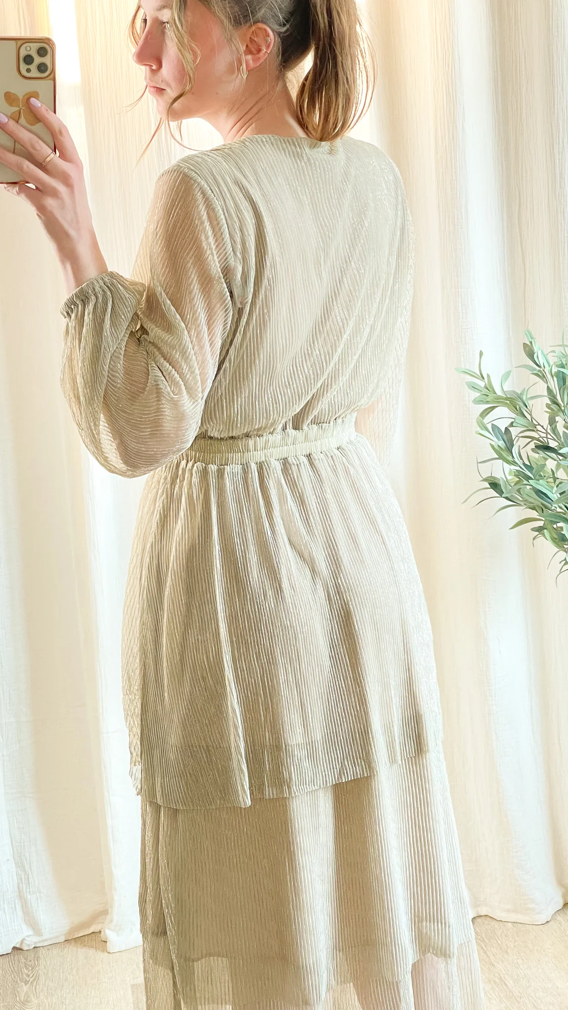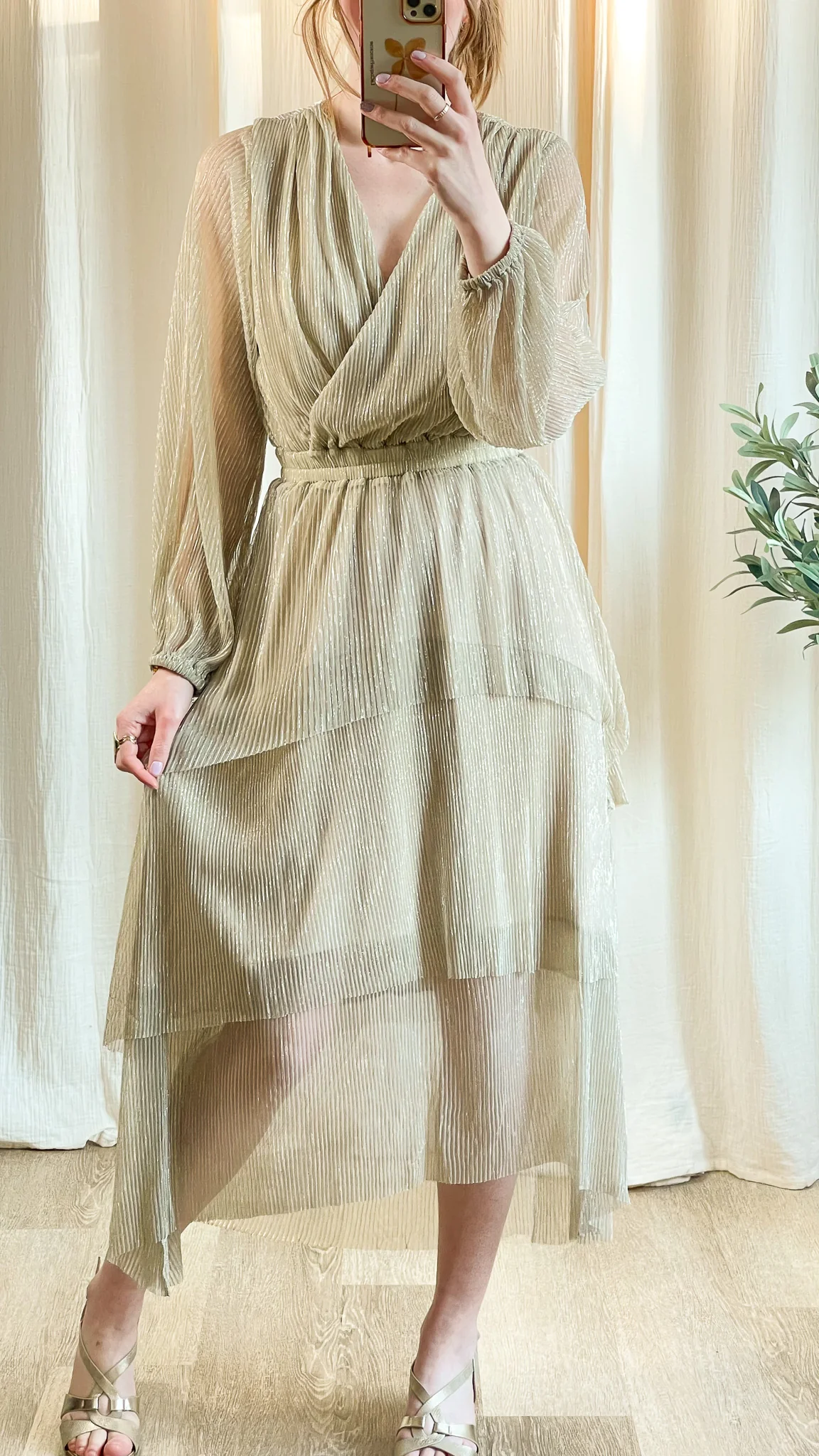 Illuminez vos soirées avec la robe Shine, une pièce élégante qui joue avec la lumière grâce à son tissu plissé à reflets dorés. Sa coupe fluide et son décolleté croisé mettent en valeur la silhouette, tandis que ses manches longues légèrement transparentes ajoutent une note sophistiquée. Sa jupe asymétrique apporte du mouvement pour un effet chic et moderne, idéal pour une cérémonie, un cocktail ou une soirée festive.