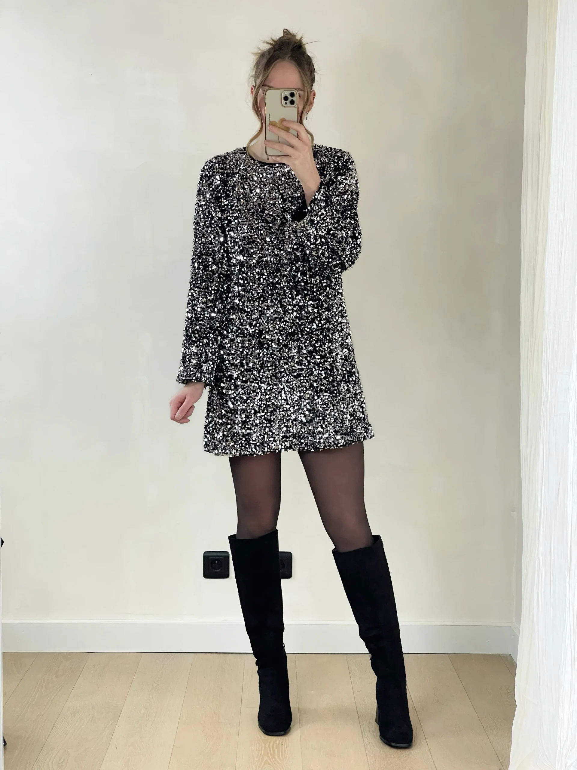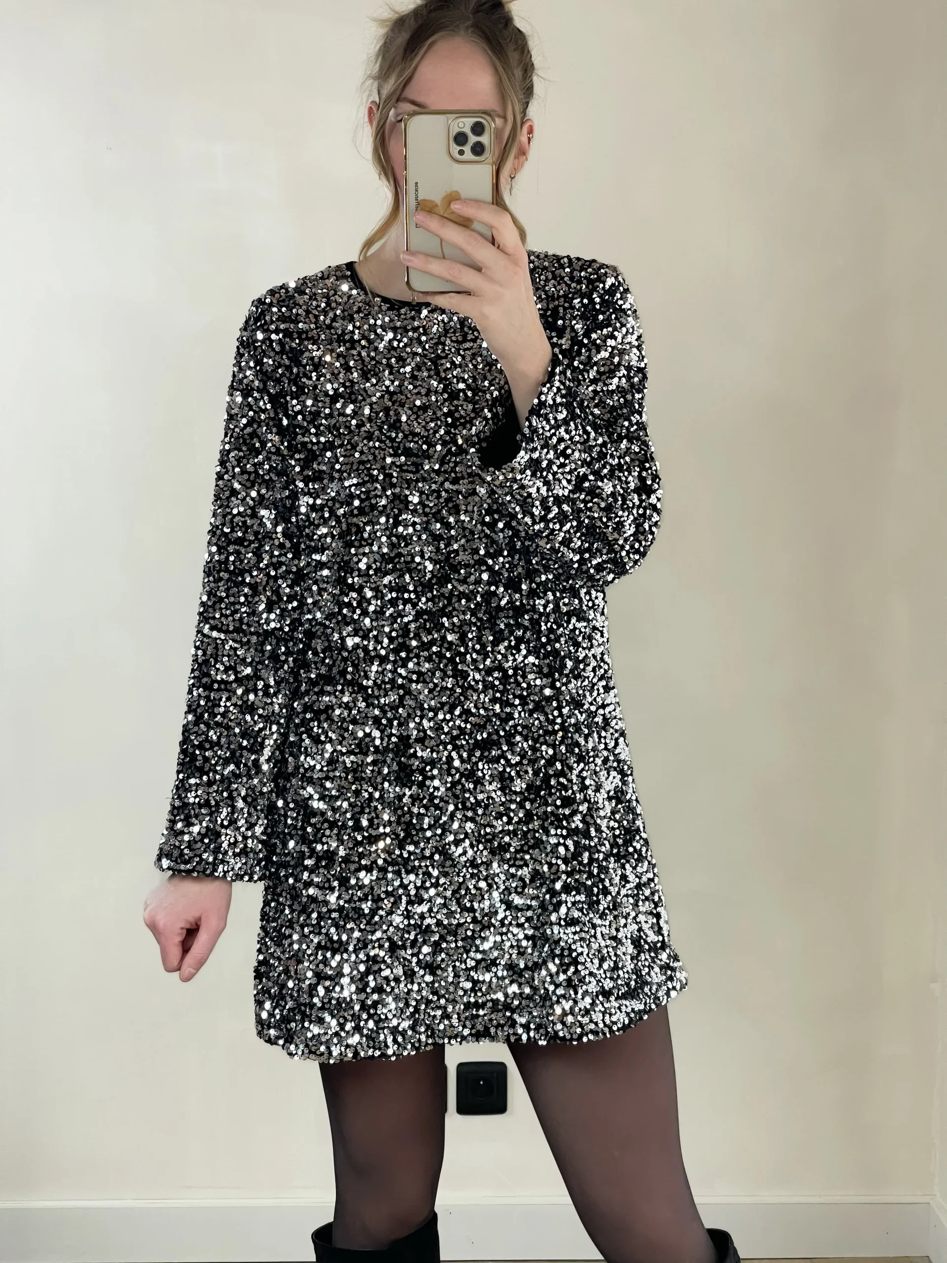 La robe Vénus est la pièce incontournable pour briller en soirée. Entièrement recouverte de sequins, elle attire la lumière à chacun de vos pas et apporte une touche glamour irrésistible. Sa coupe droite et ses manches longues offrent une silhouette élégante et moderne, idéale pour les fêtes ou les grandes occasions.