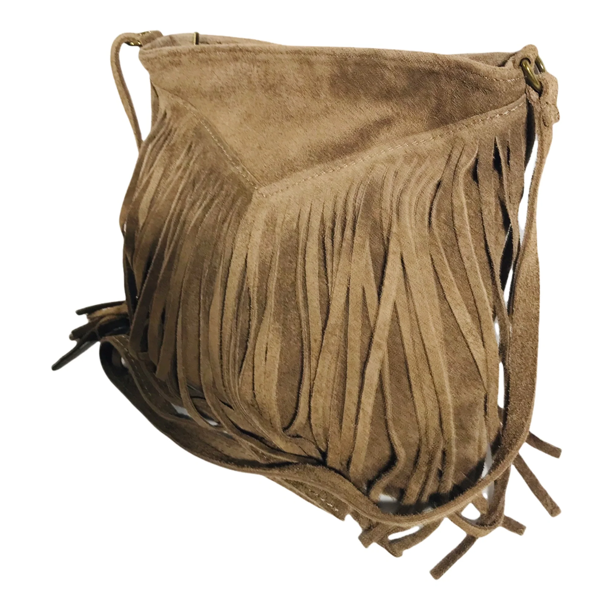 Sac bandoulière en croûte de cuir façon daim à franges pour femme.