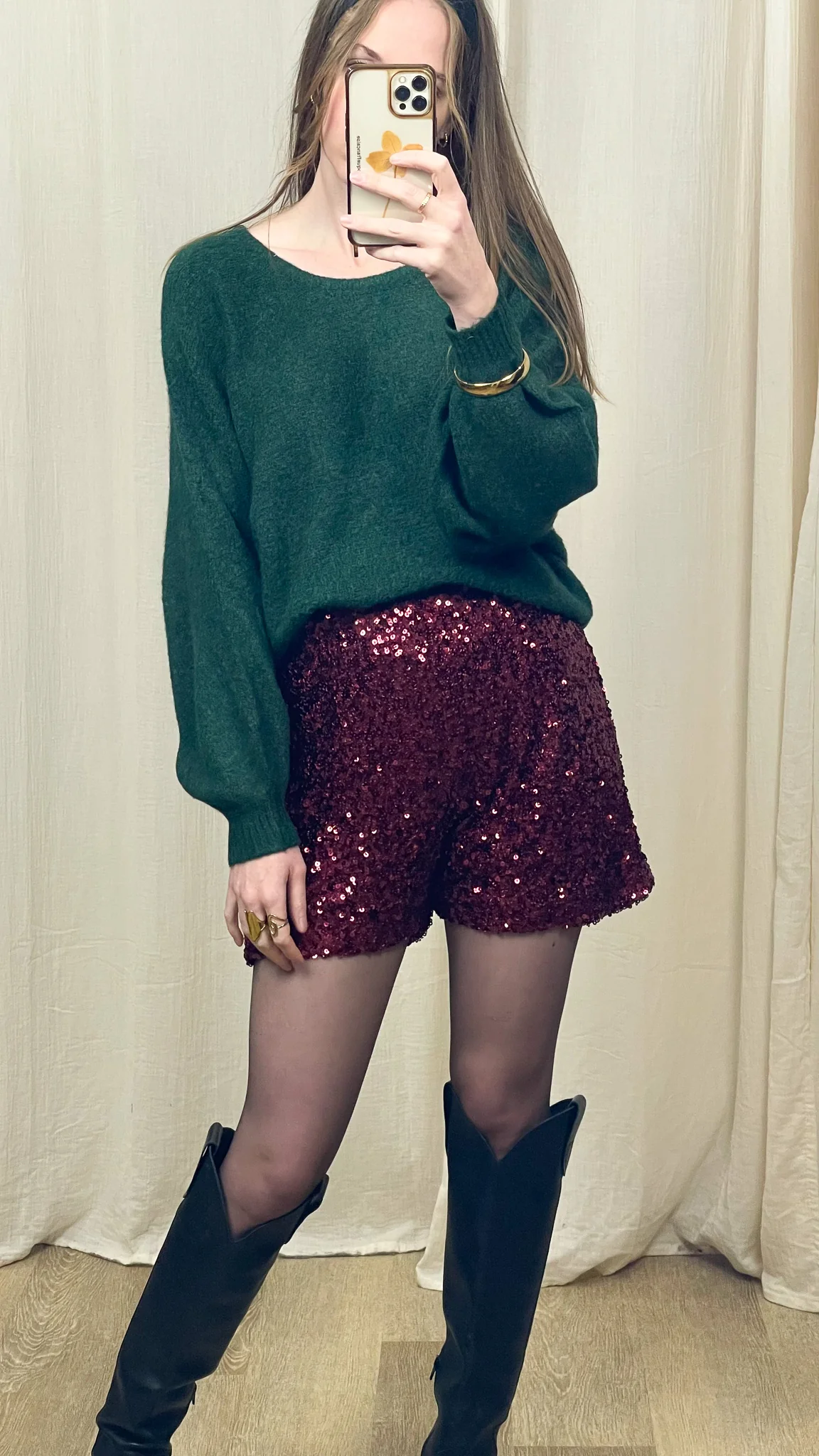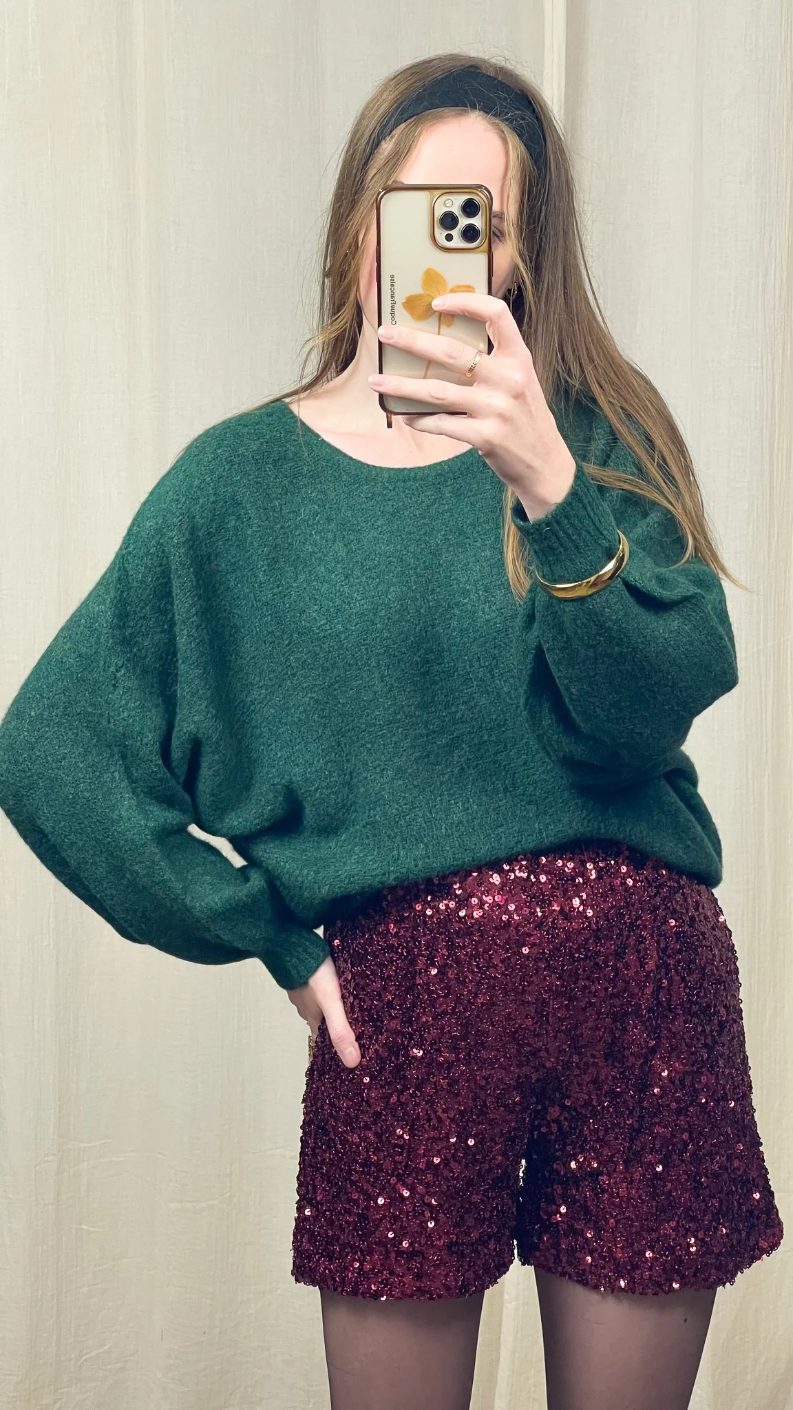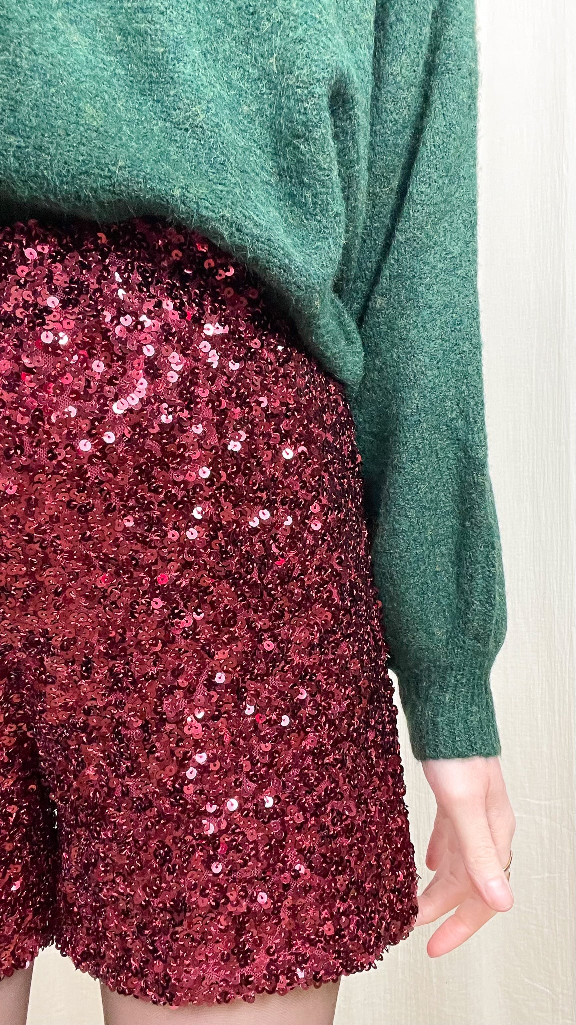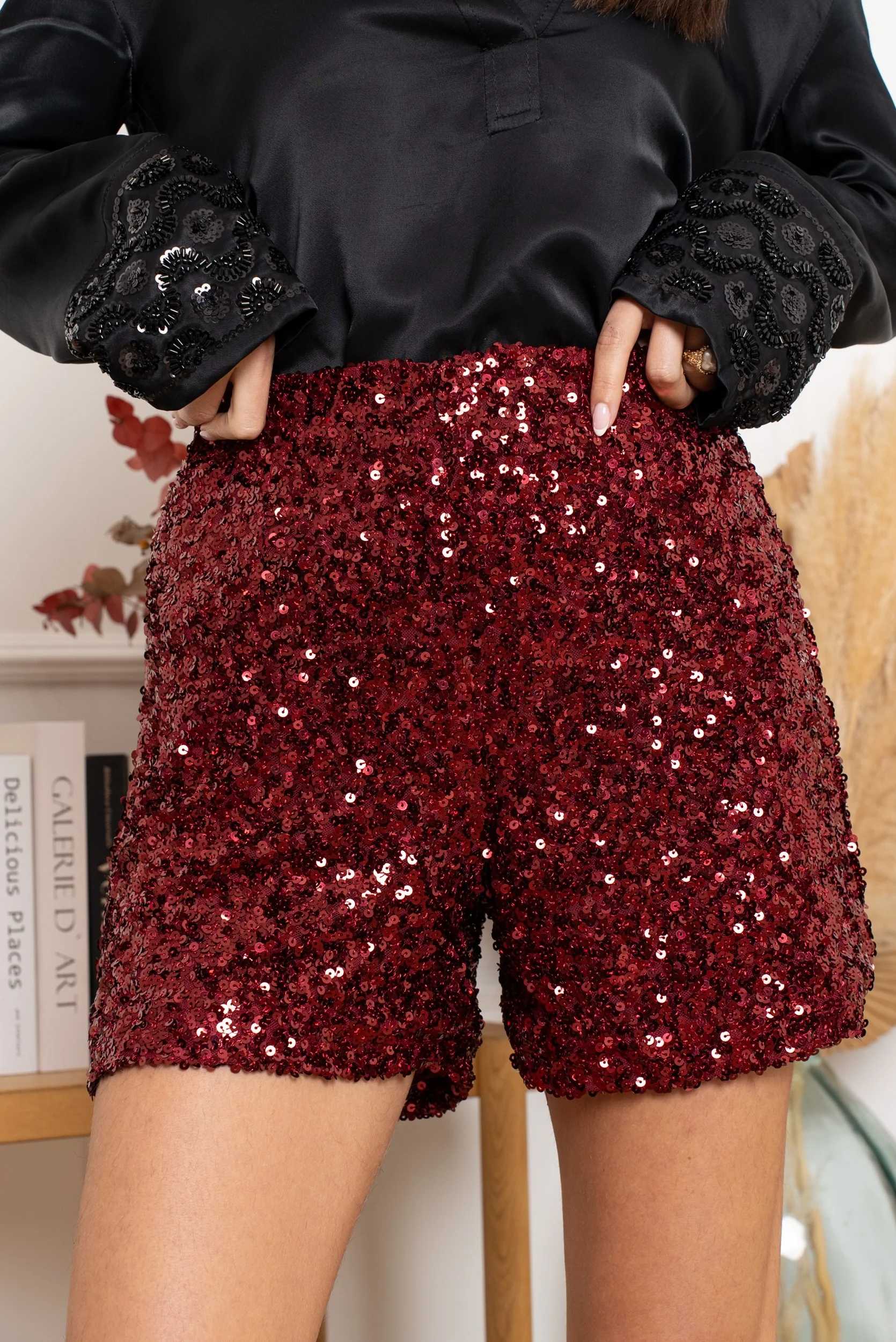 Associez le Short Iris à un pull doux oversize pour casser le côté glitter, ou à un top près du corps pour une tenue plus habillée. Avec des collants et des bottes hautes, vous obtenez un look tendance et assumé. Pour les soirées, optez pour une blouse satinée ou un blazer noir pour une silhouette chic à souhait.