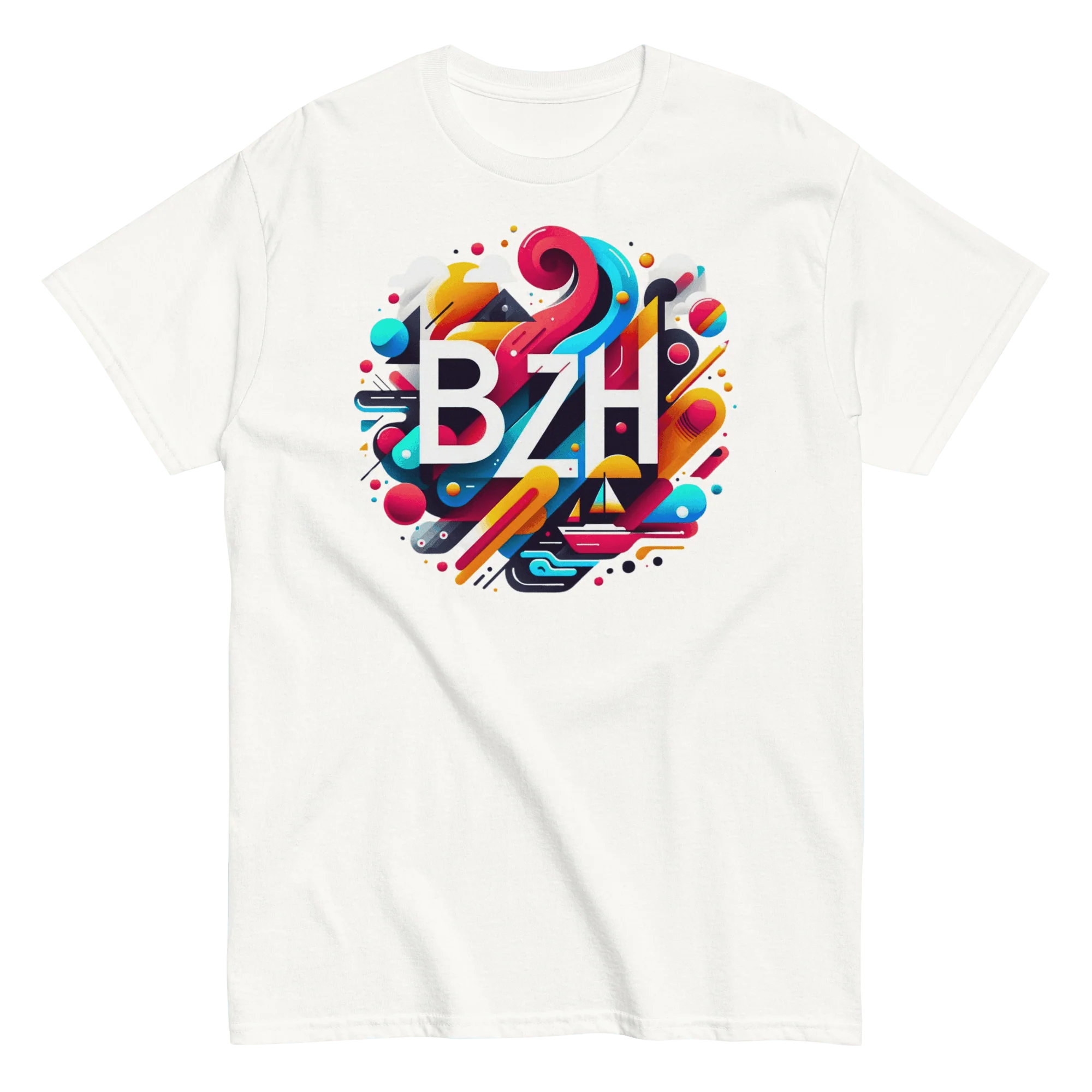 Ce t-shirt arbore un design original mettant en avant les lettres « BZH », acronyme de « Breizh » en breton, synonyme de Bretagne. Le visuel est une explosion de couleurs vives et de formes géométriques évoquant les paysages marins bretons : vagues, ciel, bateaux…