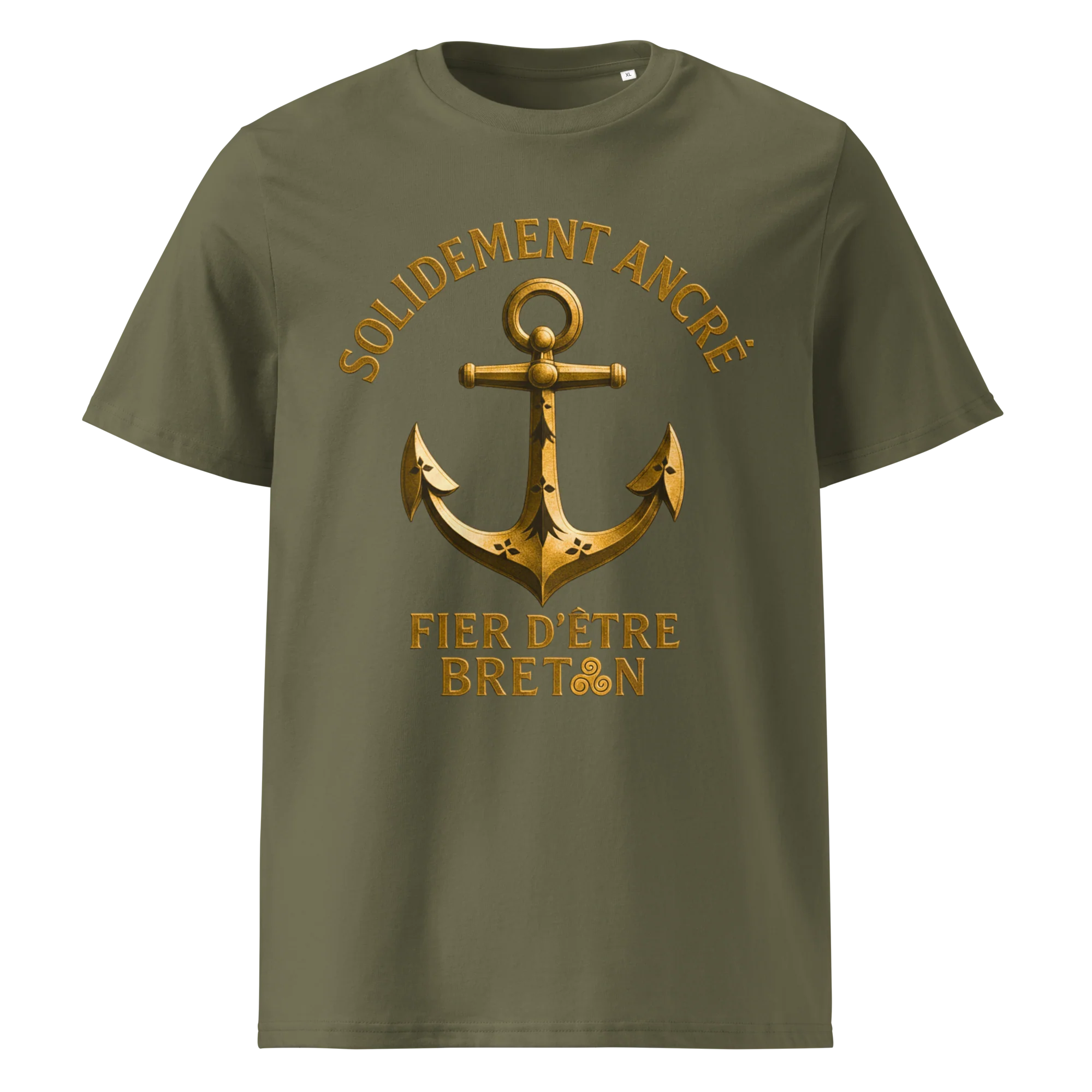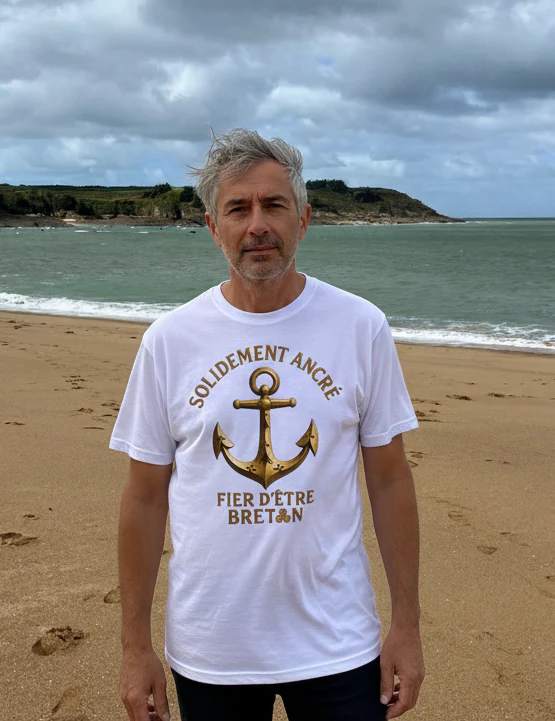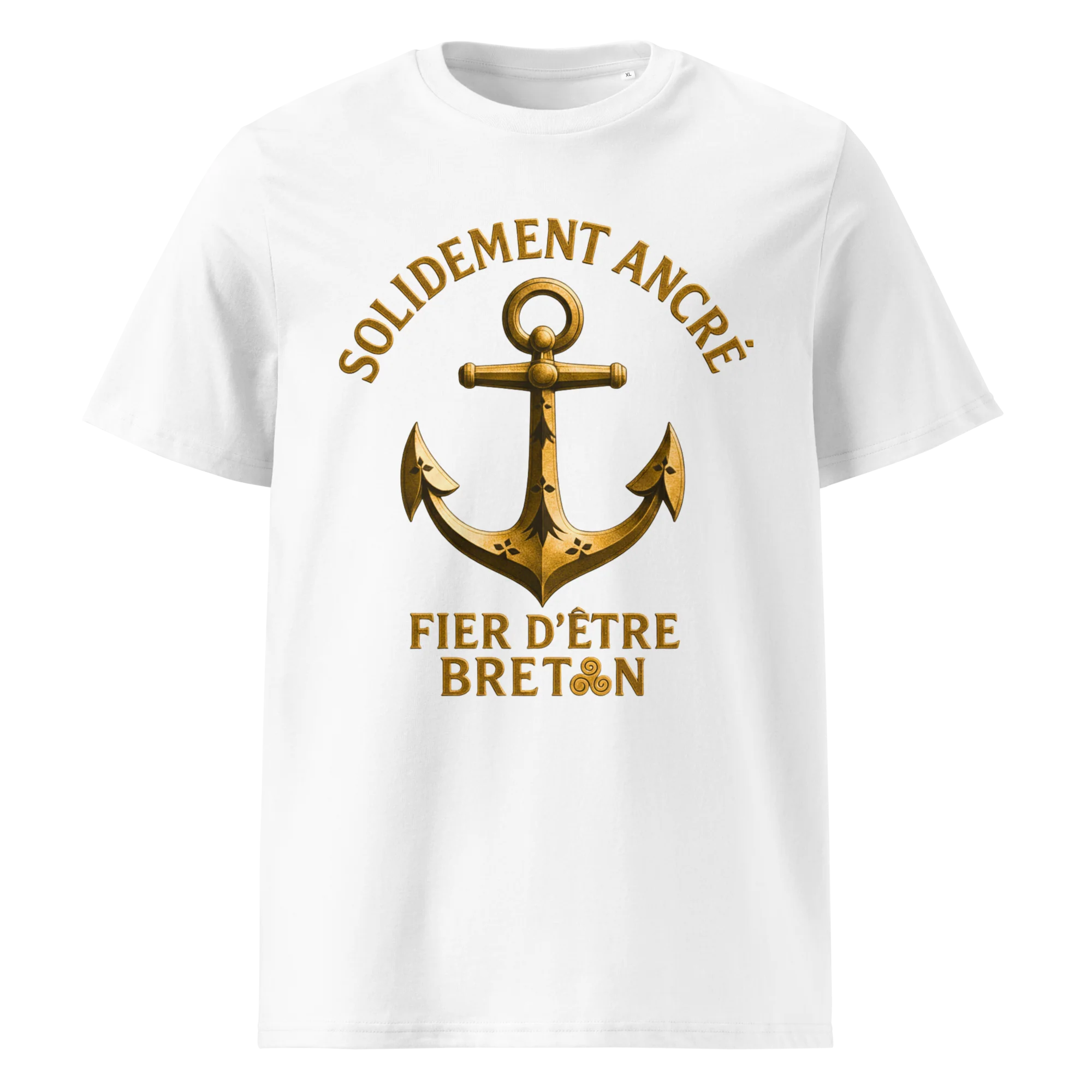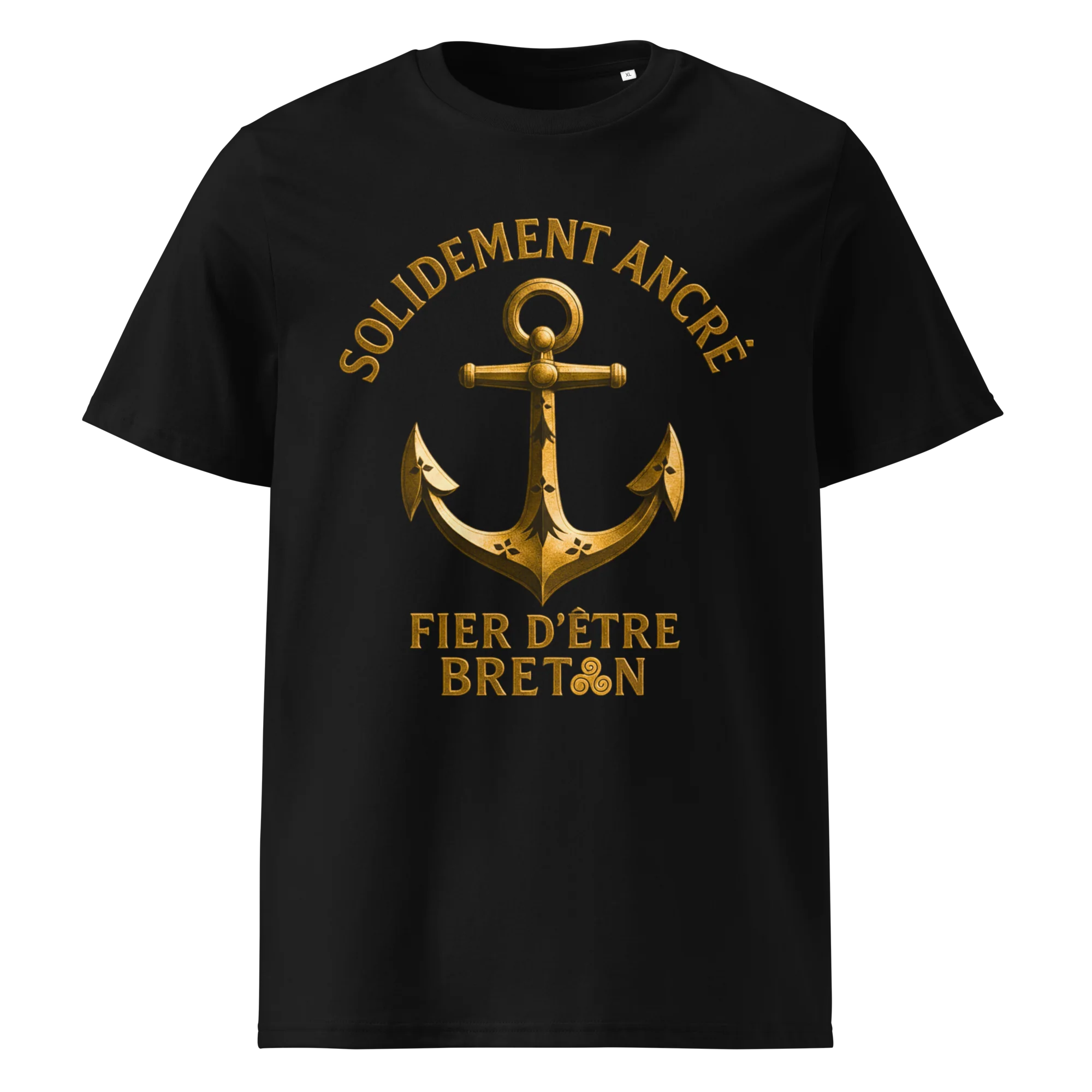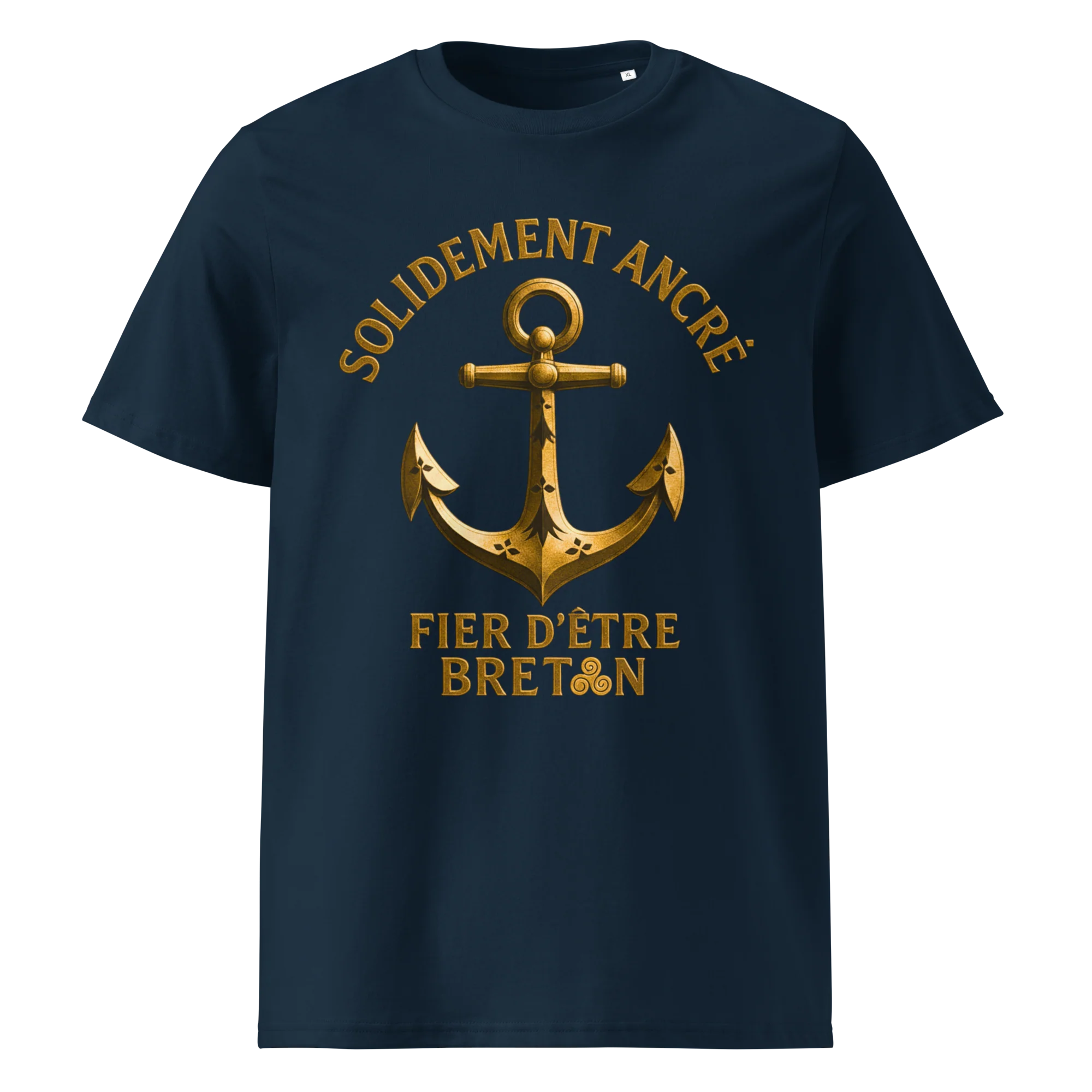 Ancre dorée, âme bretonne. Porte fièrement ton appartenance à la Bretagne avec ce t-shirt au visuel premium : « Solidement ancré. Fier d’être Breton. » Confortable, durable et 100 % coton bio.