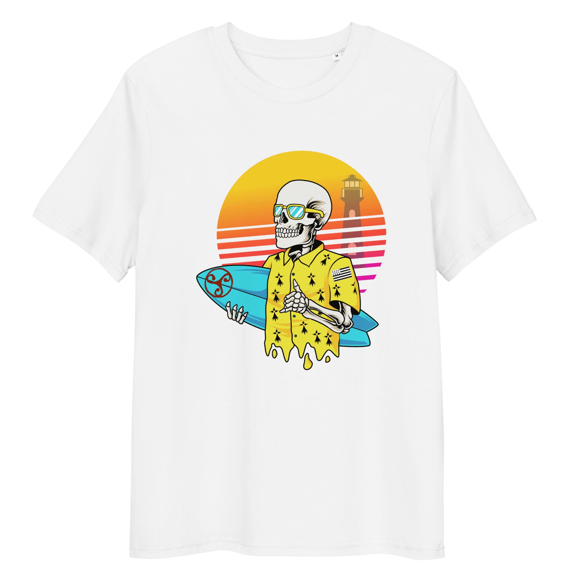 Ce T-shirt unisexe est fabriqué à 100 % en coton biologique filé à l’anneau, offrant un confort incomparable et une douceur exceptionnelle. Son design décalé met en scène un squelette surfeur arborant une chemise aux couleurs de la Bretagne, des hermines et le drapeau breton. La planche de surf qu’il tient fièrement arbore un triskell, symbole celtique emblématique, tandis que sa main levée effectue le célèbre shaka, salut incontournable des surfeurs.