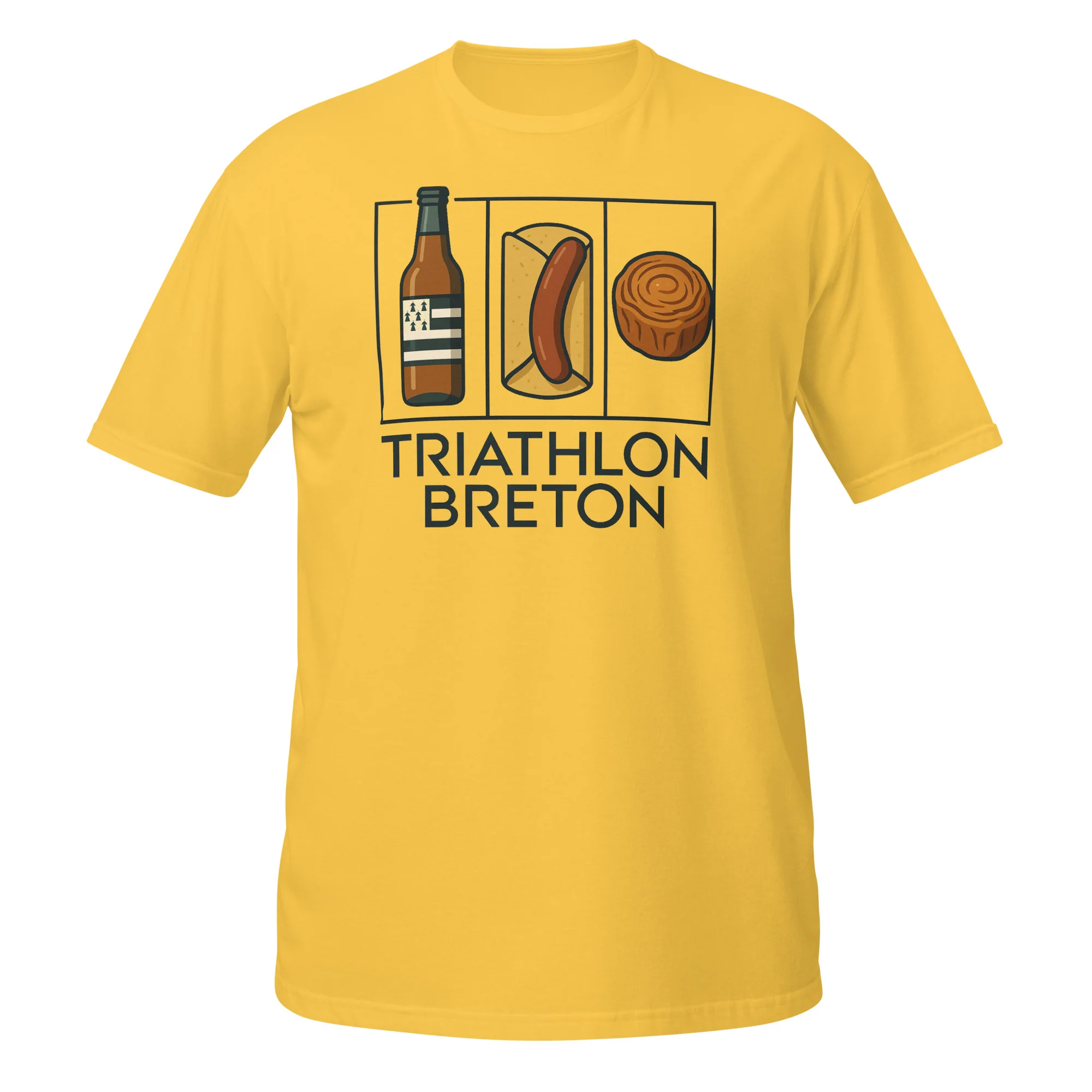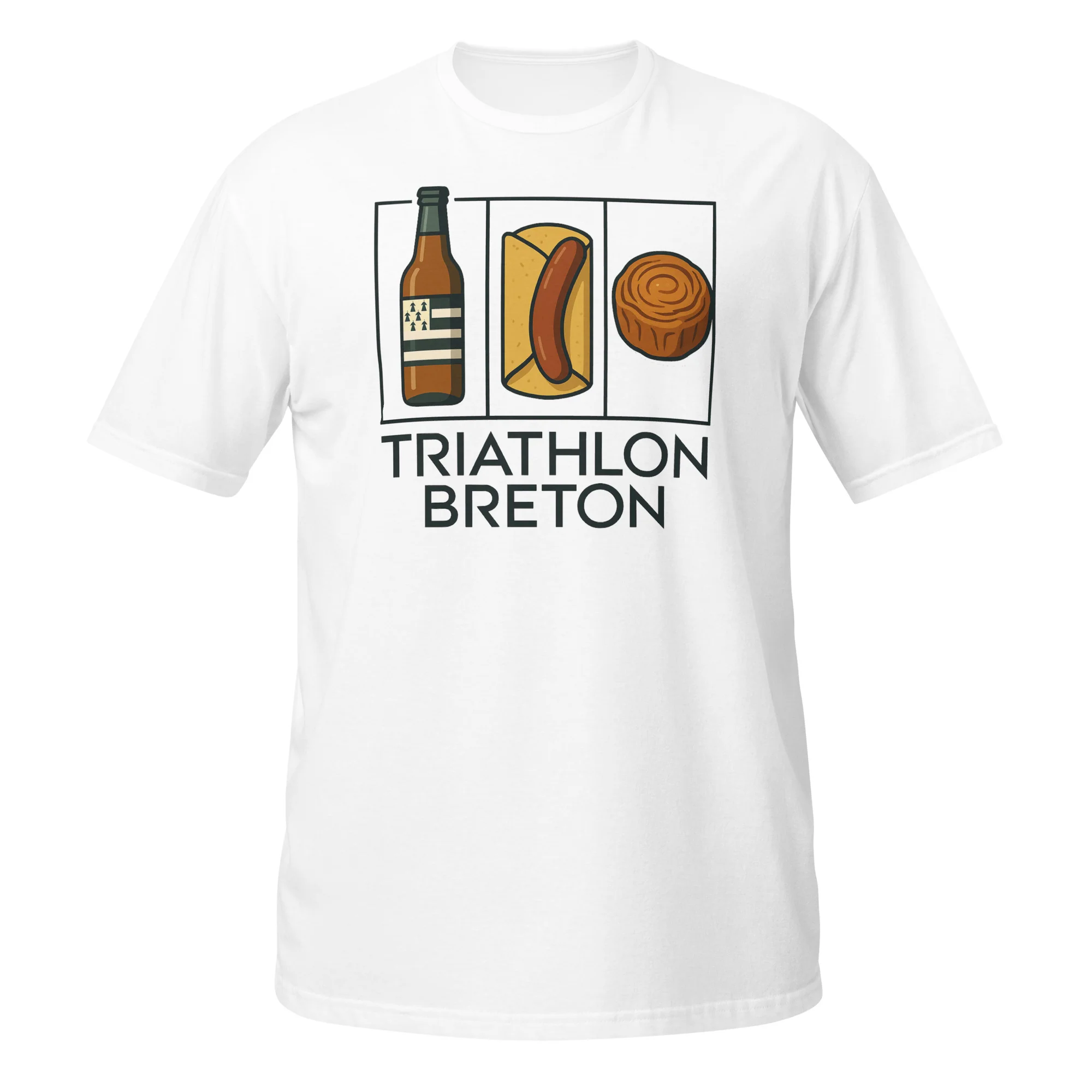 T-shirt « Triathlon Breton » en 100 % coton filé à l’anneau (153 g/m²). Design exclusif illustrant la célèbre “triade” bretonne : une bouteille de bière artisanale avec gwenn-ha-du, un bon kouign-amann et une galette saucisse, pour un clin d’œil humoristique au Triathlon made in Bretagne. Idéal comme cadeau pour amateurs de la Bretagne, de la culture bretonne et du triathlon (ou tout simplement du bon vivre !).