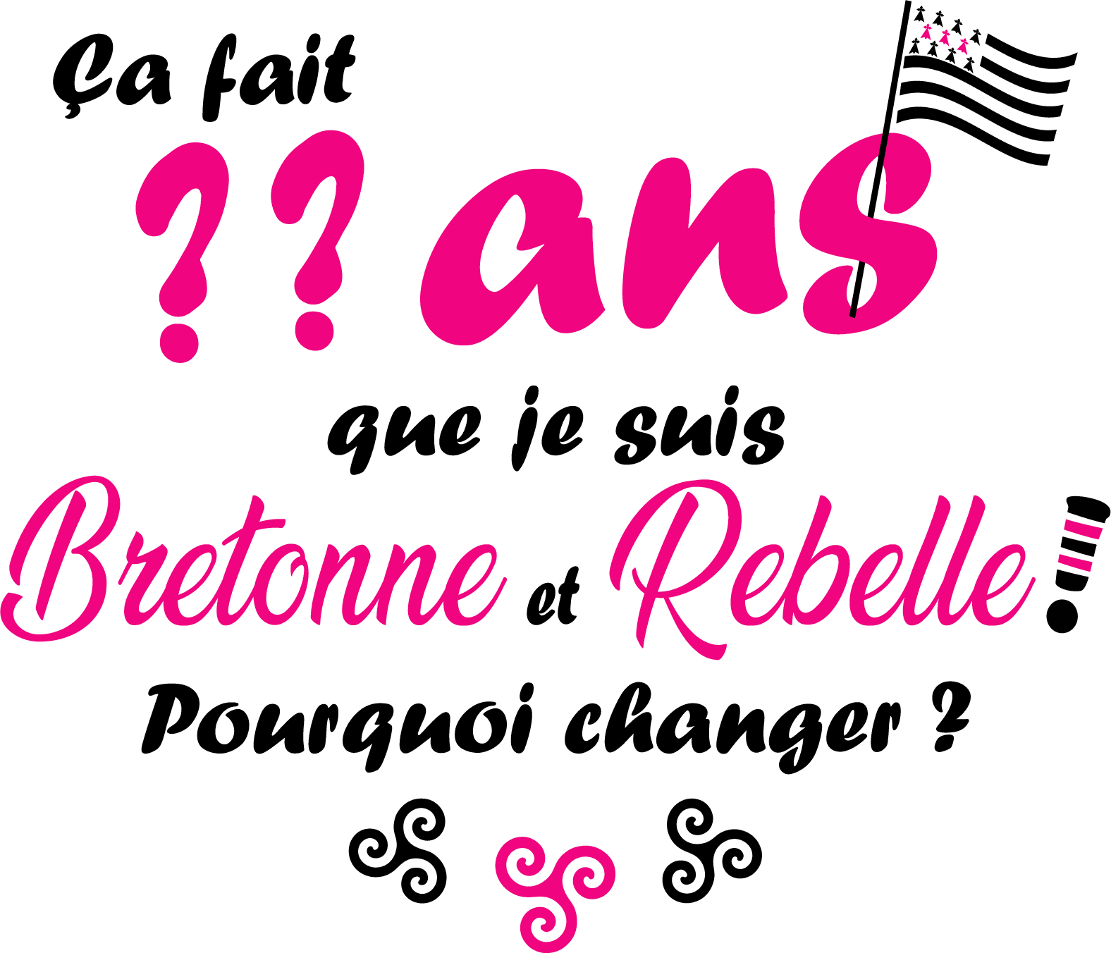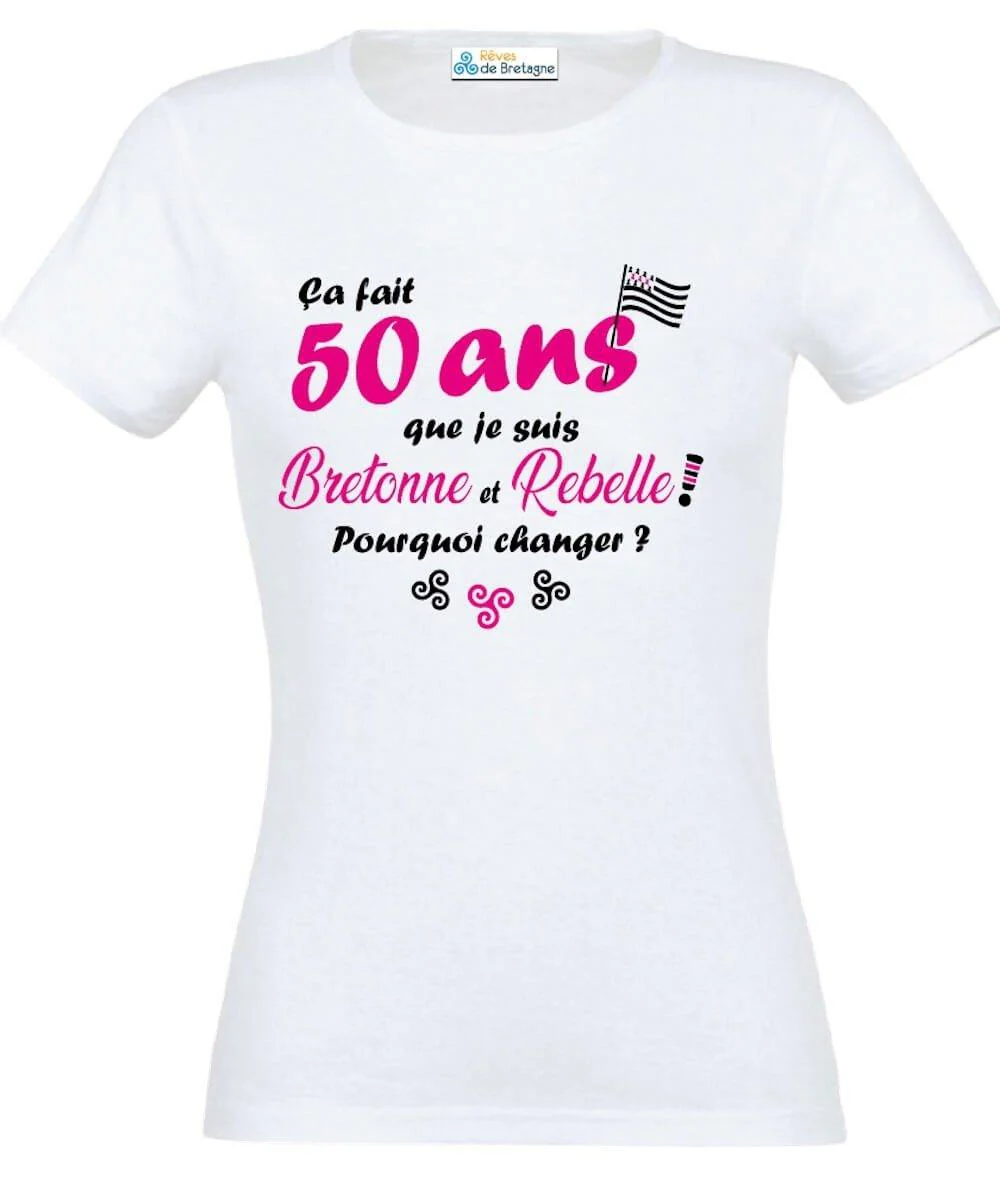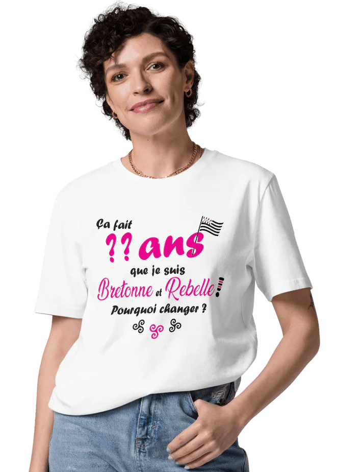 Affichez votre fierté bretonne pour votre anniversaire avec notre tee-shirt pour femme « ÇA FAIT 40 ANS QUE JE SUIS BRETONNE ET REBELLE POURQUOI CHANGER ? ».