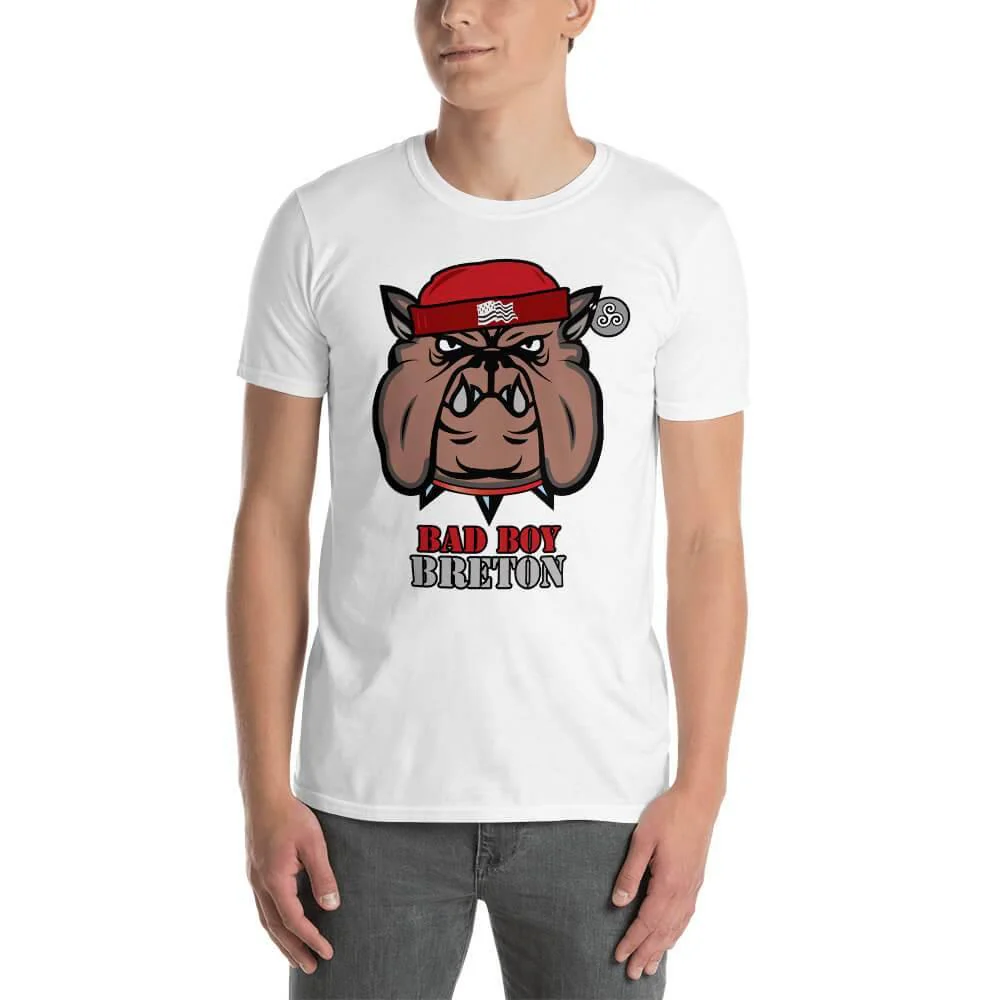 Tee-shirt Breton Bad Boy avec illustration d »un Bulldog coiffé d’un Bonnet Rouge.