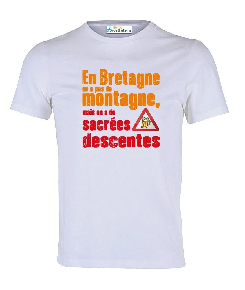 Tee-shirt blanc avec inscription couleur « En Bretagne on n’a pas de Montagne, mais on a des sacrées Descentes »