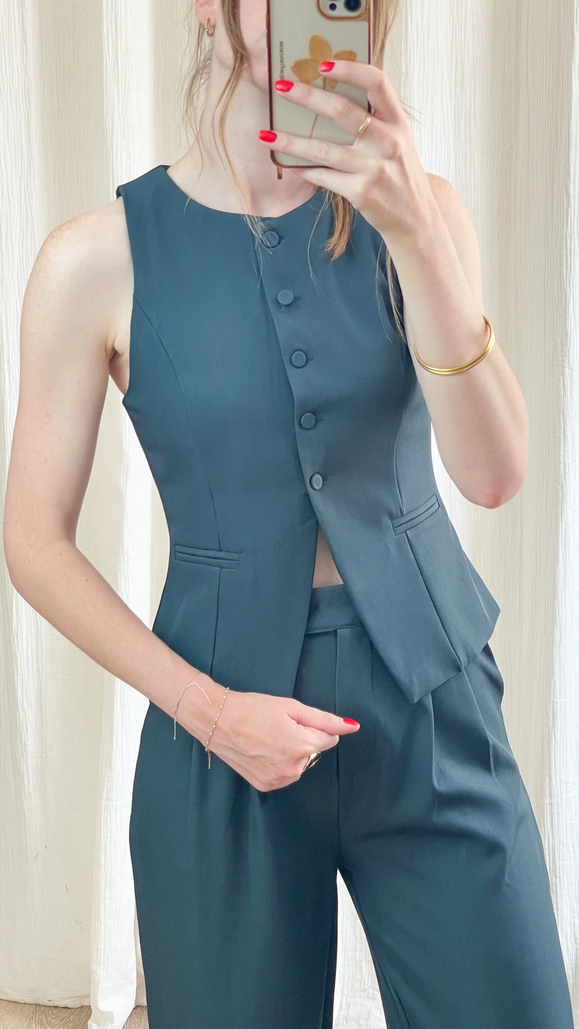 Le Veston Chloé revisite l’esprit tailleur dans une version sans manches élégante. Sa coupe ajustée et structurée met en valeur la silhouette, tandis que ses boutons ton sur ton apportent une finition raffinée. Facile à associer, il se porte aussi bien avec son pantalon coordonné qu’avec un jean pour un look plus décontracté.